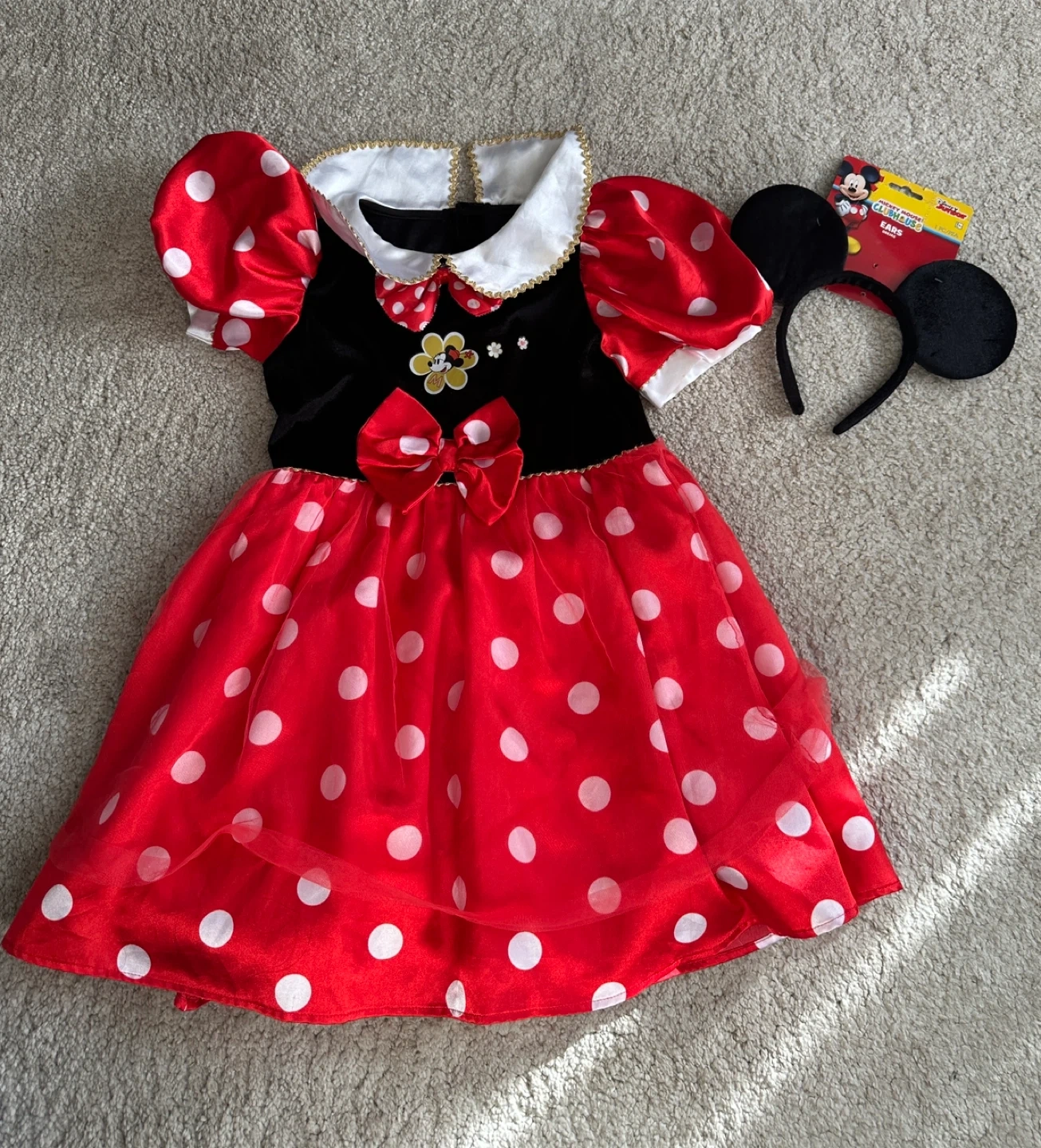 287Adorable Minnie Mouse dress with matching ears! Perfect for dress-up or a trip to Disney. The dress is red with white polka dots and has a cute bow. Comes with the Minnie Mouse ears headband to complete the look