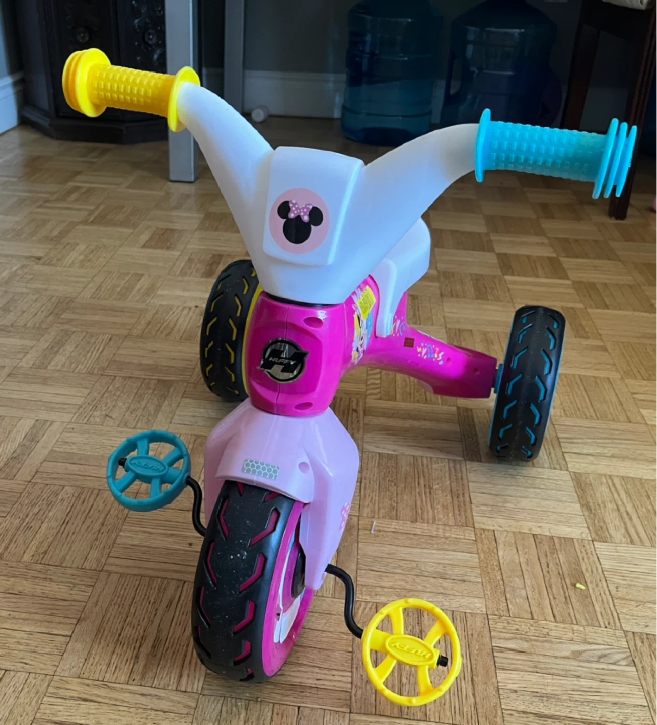 Here's a cute Minnie Mouse trike with lights It's perfect for toddlers who are learning to ride. The trike features Minnie Mouse designs and has fun lights to keep your little one entertained. It's in great condition and ready for a new home!