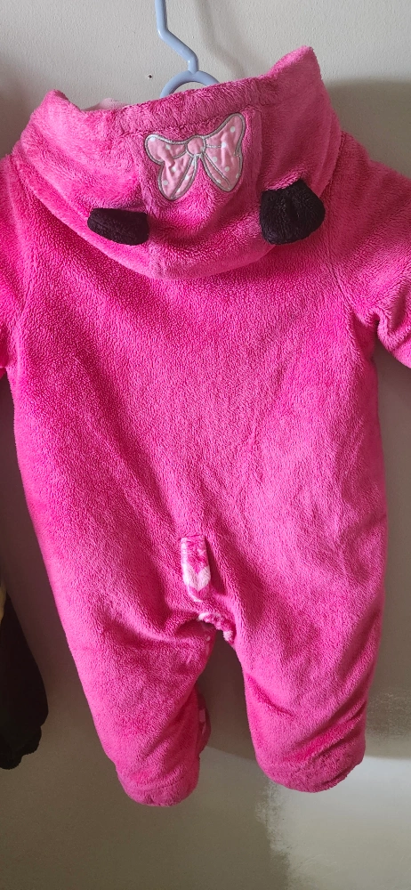 Super cute and cozy Minnie Mouse fleece onesie! It's pink and features a Minnie Mouse design with hearts on the front. Perfect for keeping your little one warm during the colder months. In great condition!