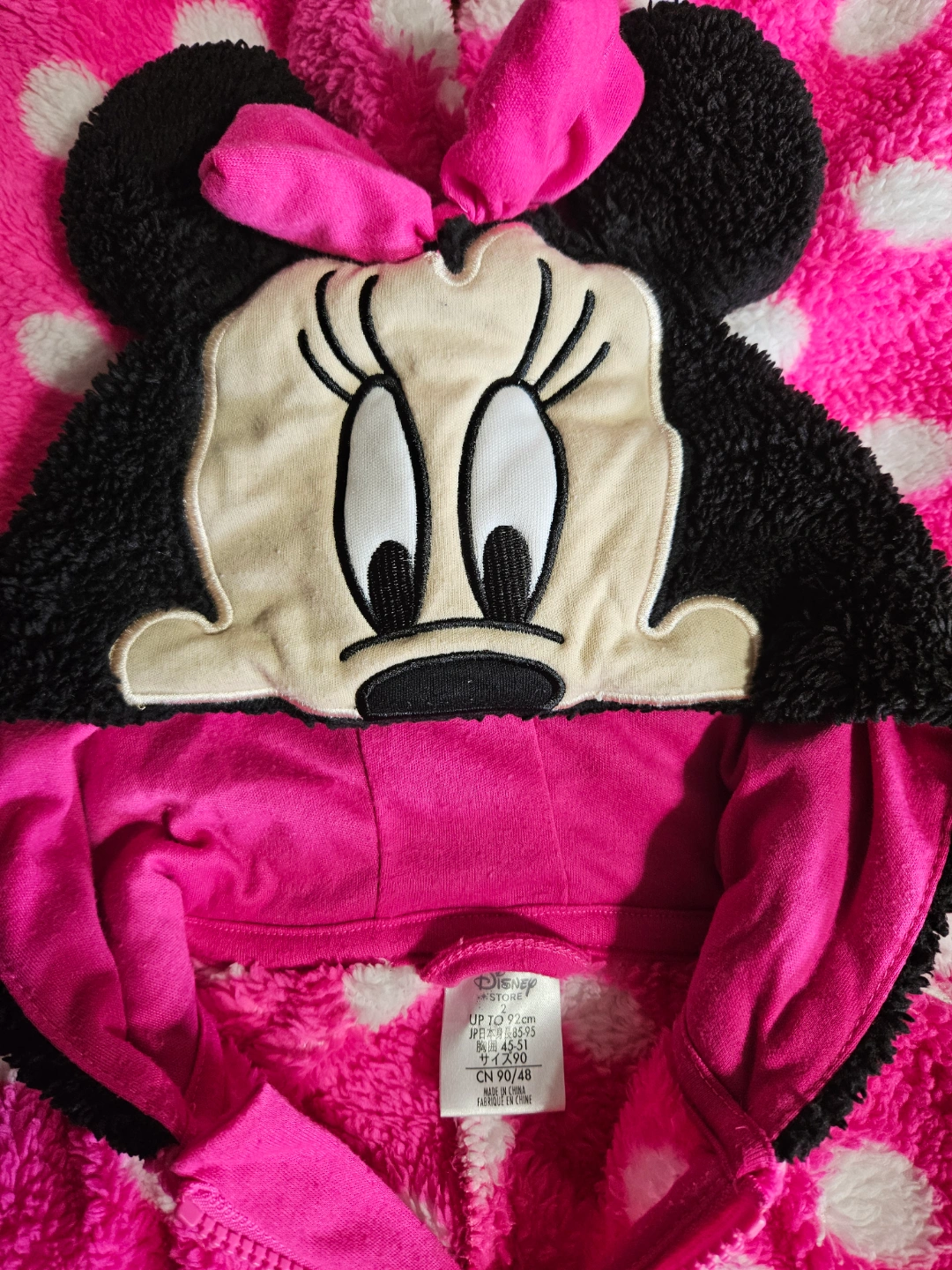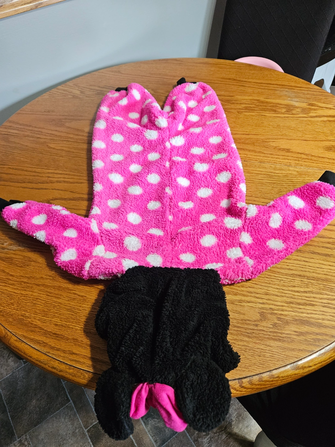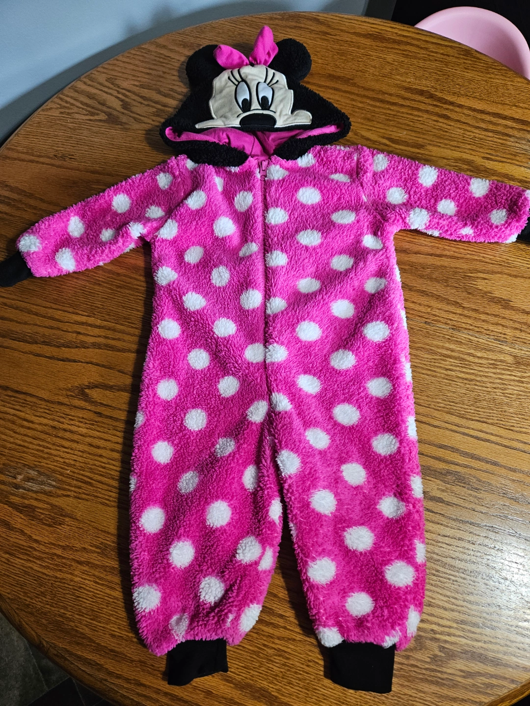 Adorable Minnie Mouse onesie. Pink fleece with white polka dots. Features a Minnie Mouse hood. Zip closure. Great for cozy nights.
