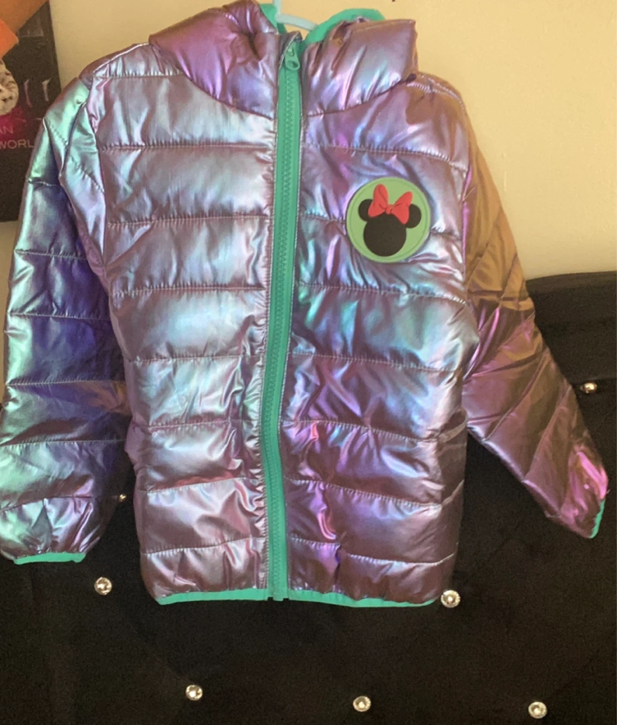 10Selling a cute Minnie Mouse puffer jacket! It has a shiny, iridescent finish with a bright green zipper and trim. Perfect for keeping your little one warm and stylish! 3T
