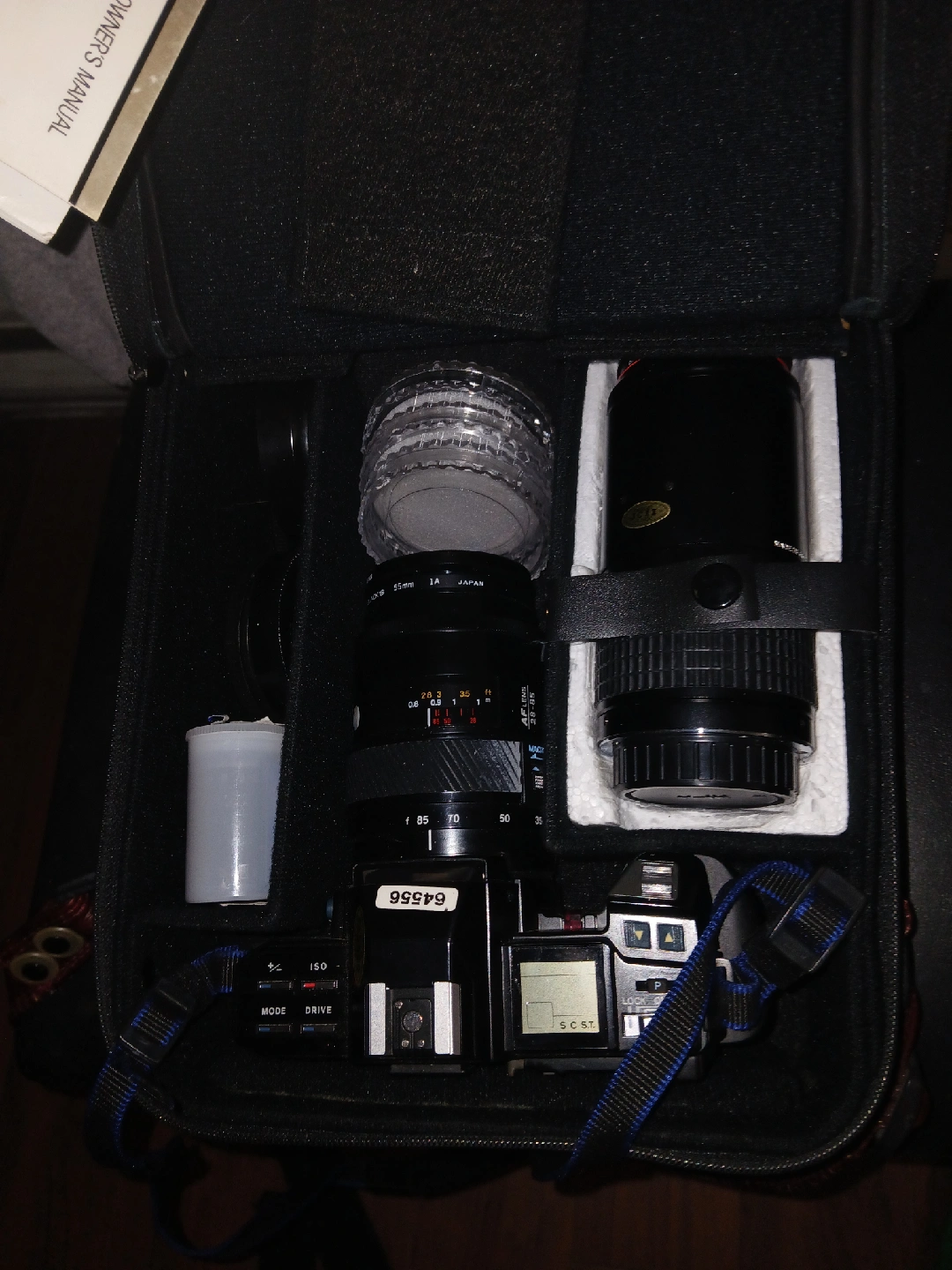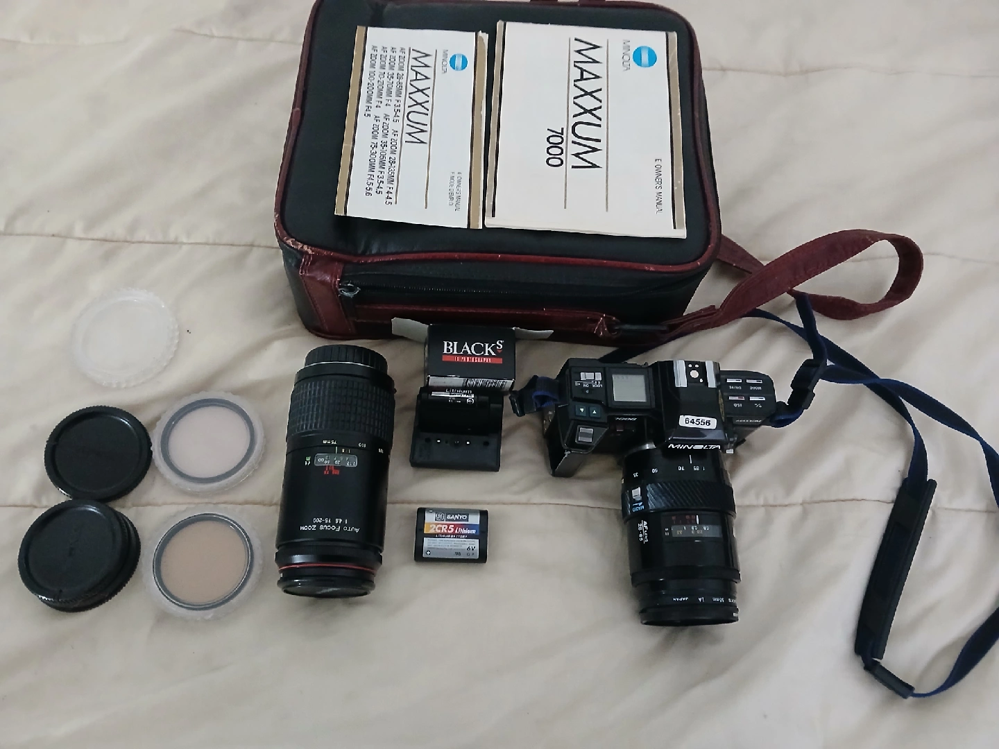 15Minolta 7000 comes with 28-85 after zoom,a af zoom 75-200 lens several filters,manuals for the camera and zoom lenses,case,a roll of film,2 batteries ...there is no flash for this