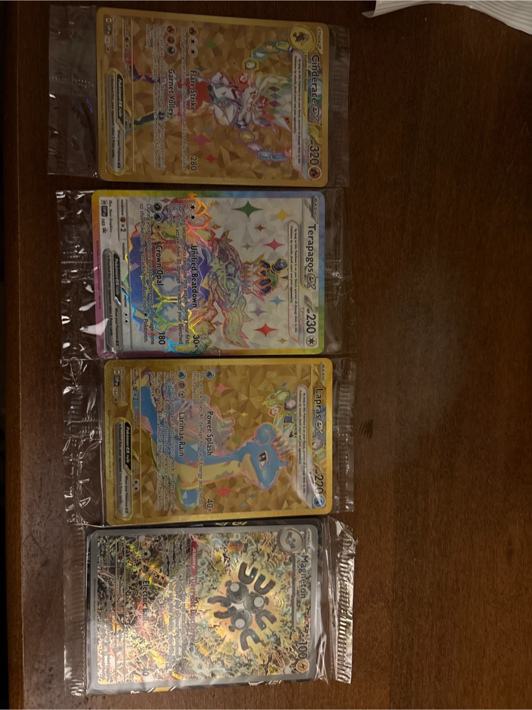 Selling a set of Pokémon EX Promo cards! Includes Cinderace EX, Magneton, Lapras EX, and Terapagos EX. Great for collectors or players looking to add some shiny cards to their deck