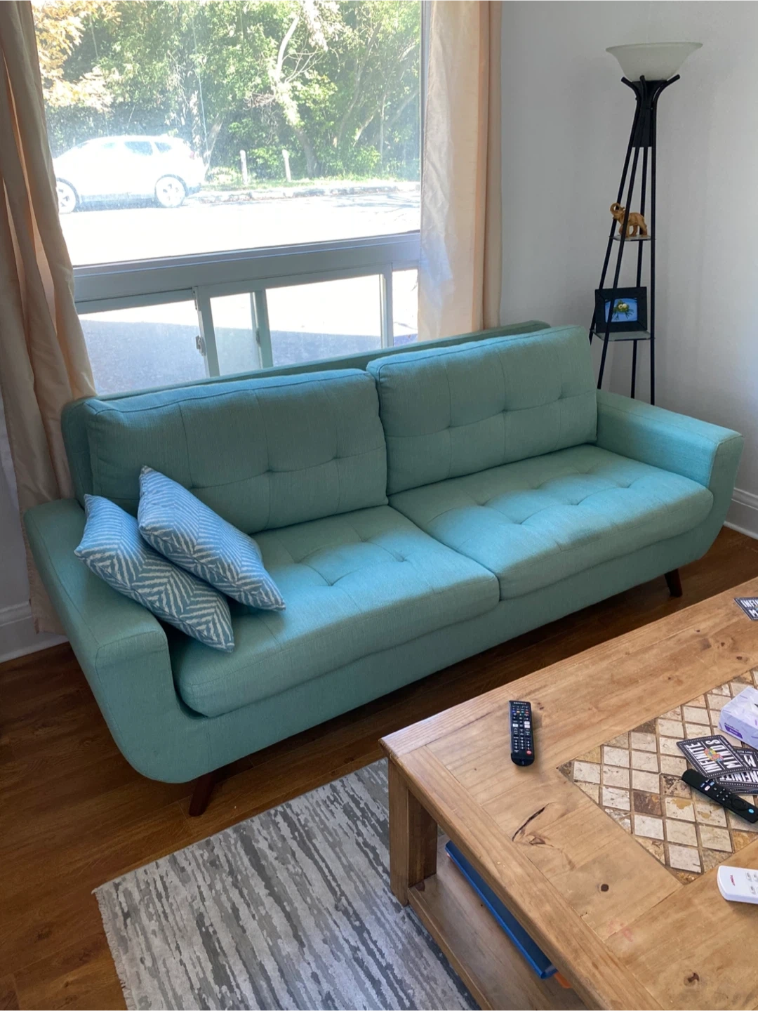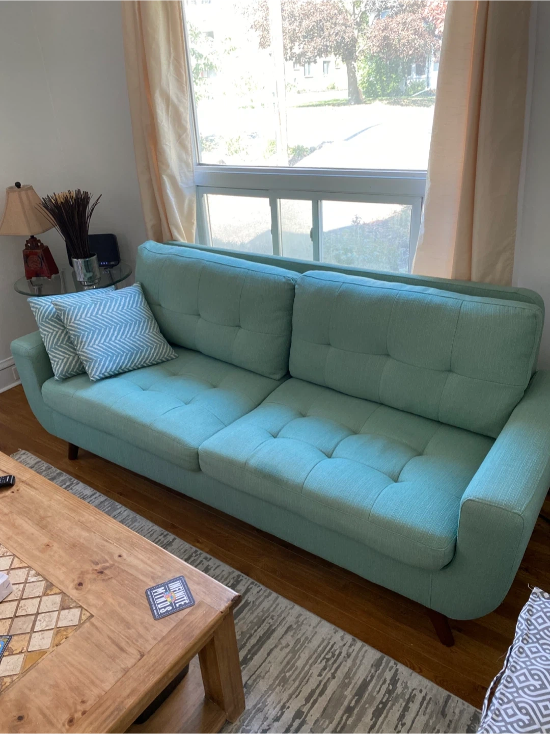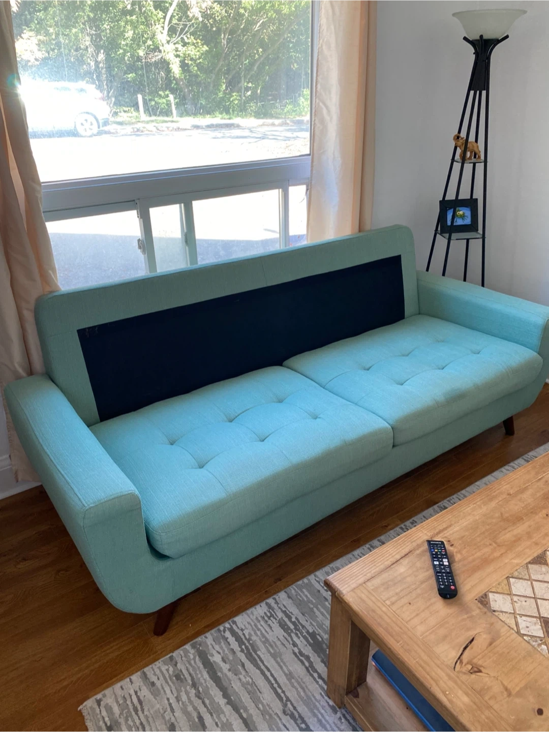 Selling a sofa in a lovely mint green colour! It's in great condition and would be a stylish addition to any living room. It's a comfortable size for lounging and relaxing after a long day. Feel free to reach out if you're interested or have any questions! Cushions are Velcro for good hold and remove easily to turn into sofa bed! Back removes completely for easy moving through awkward doors and spaces!