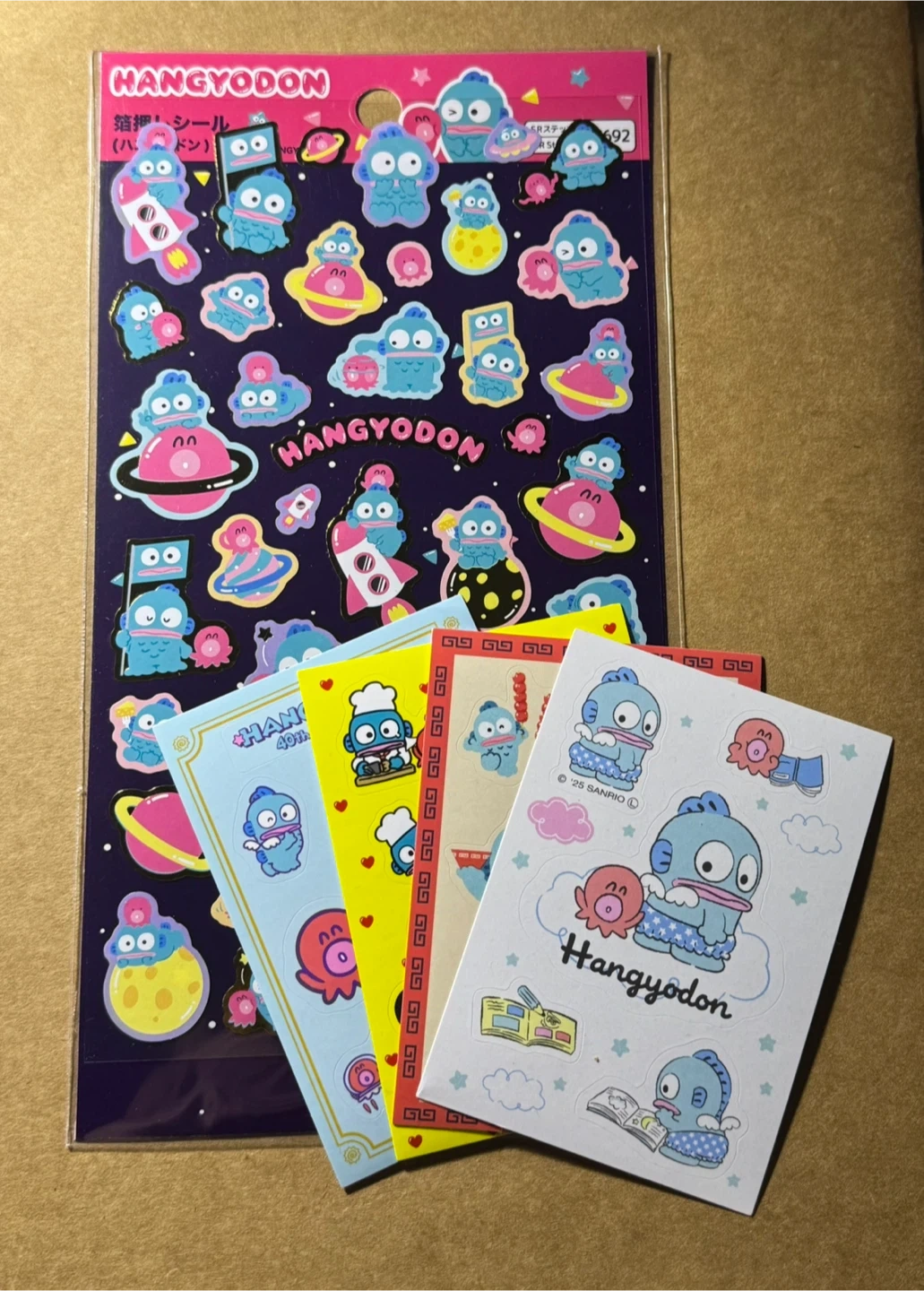This set includes a large sticker sheet featuring Hangyodon and friends in space-themed designs, plus four smaller sticker cards. All stickers are colourful and fun for decorating planners or notebooks.