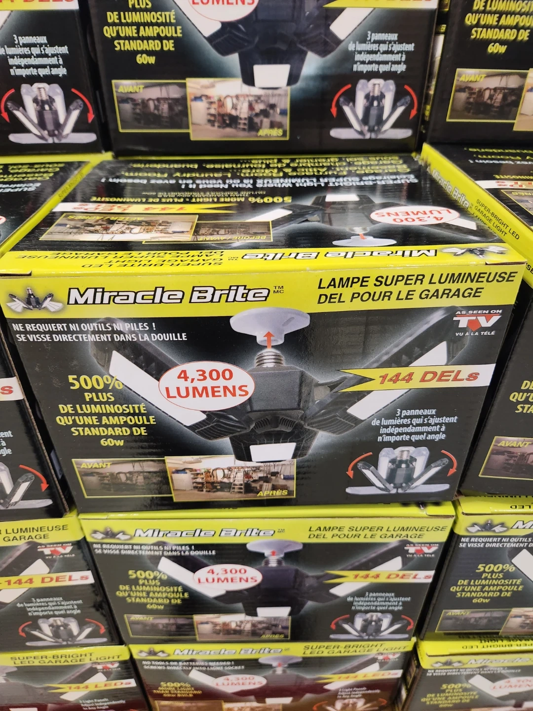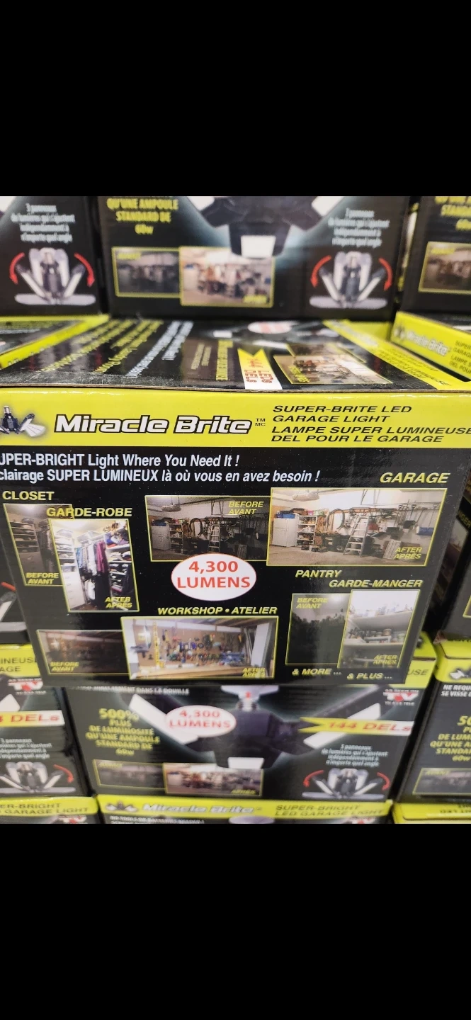 39Selling a brand new Miracle Brite LED Garage Light! It's still in its original box and ready to brighten up your space. This super-bright light provides 4,300 lumens, making it perfect for your garage, workshop, or even a closet. It's designed for easy installation and offers 500% more light than a standard 60W bulb
