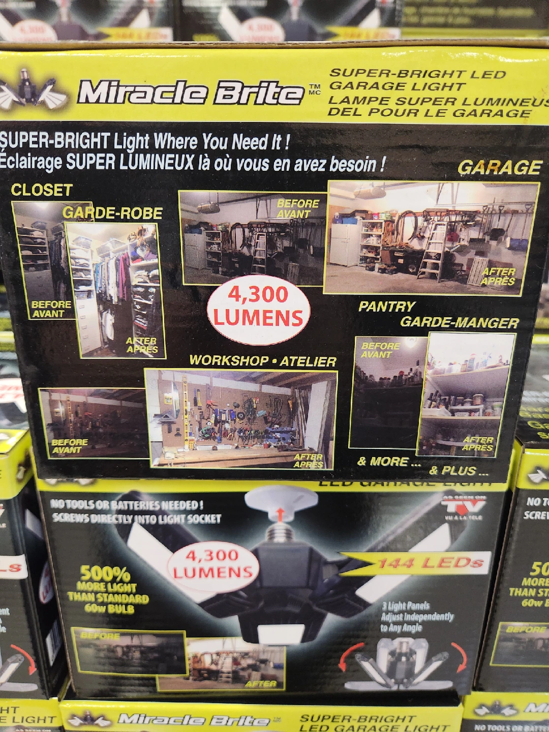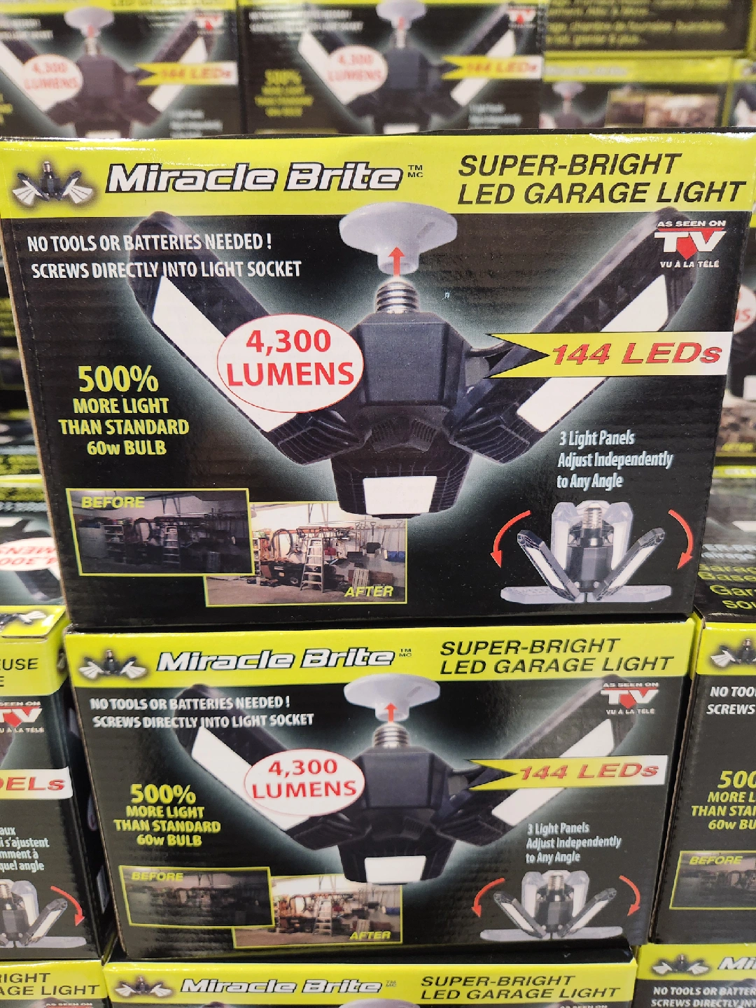 31Get your garage or workshop lit up with this Miracle Brite Super-Bright LED Garage Light! It boasts 4,300 lumens and 144 LEDs for amazing brightness. The three light panels adjust independently to any angle, and it screws directly into a light socket - no tools or batteries needed