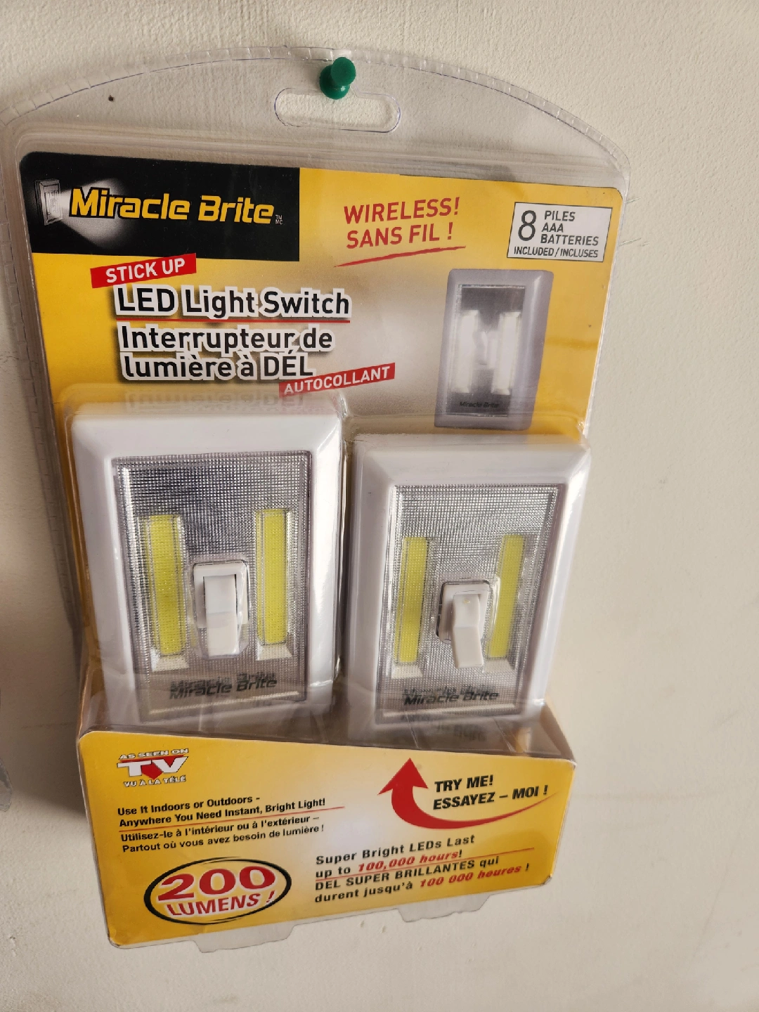 Selling a brand new Miracle Brite LED Light Switch. It's wireless and easy to install with its stick-up design. Perfect for indoors or outdoors, providing instant and bright light. Super bright LEDs last up to 100,000 hours! It also includes 8 AAA batteries