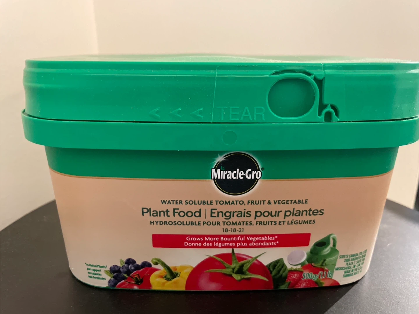 Unopened. I'm selling a container of Miracle-Gro Water Soluble Tomato, Fruit & Vegetable Plant Food. It grows more bountiful vegetables and is great for all plants. It's water-soluble and easy to use with watering cans or the Miracle-Gro Garden Feeder. The container has 500 g / 1.1 lb of plant food. Pick up in Nepean centerpointe area. Delivery available in Ottawa area for negotiable price.