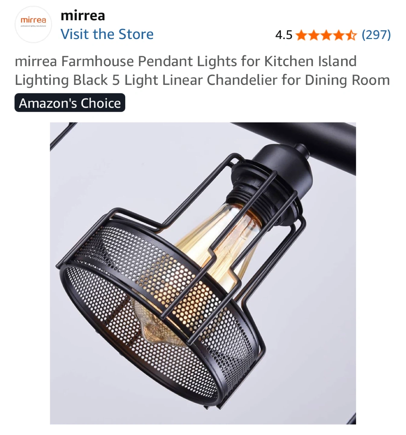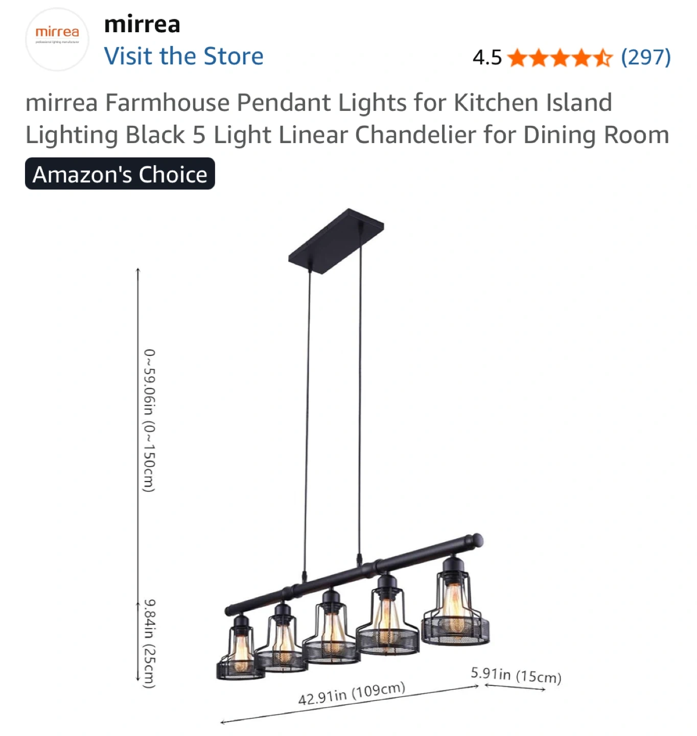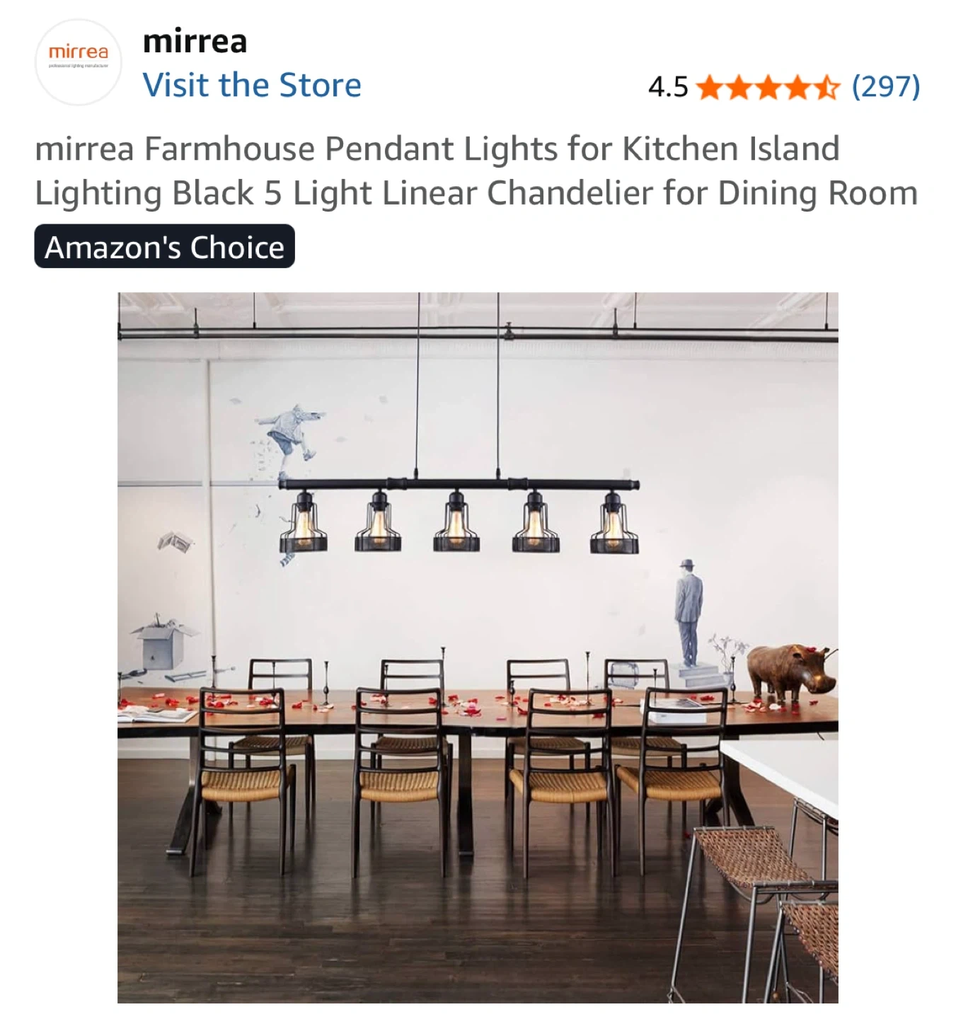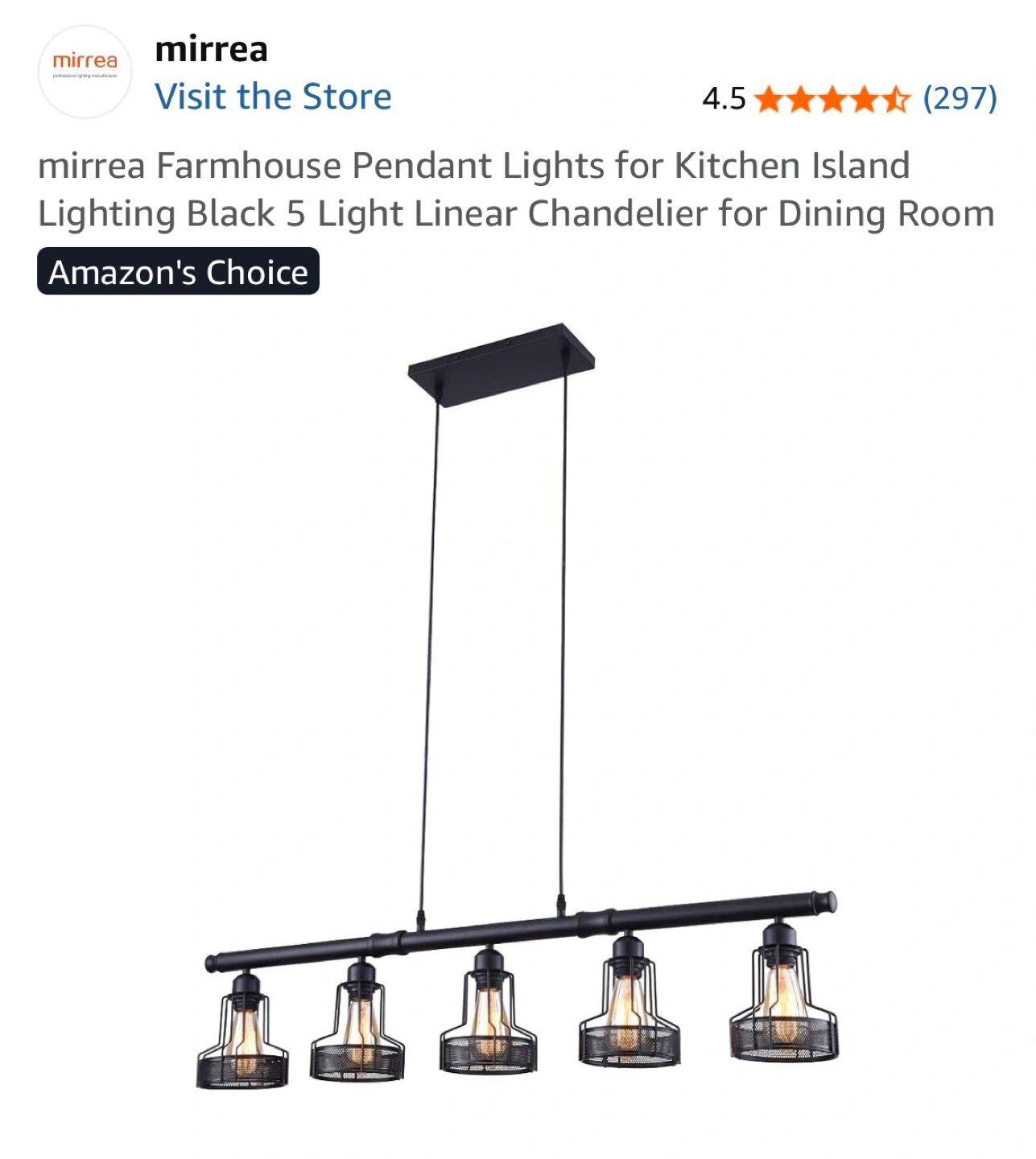 This is a Mirrea farmhouse pendant light, perfect for a kitchen island or dining room. It features a linear chandelier design with 5 lights in a stylish black finish. It's an Amazon's Choice item, so you know it's a great pick!