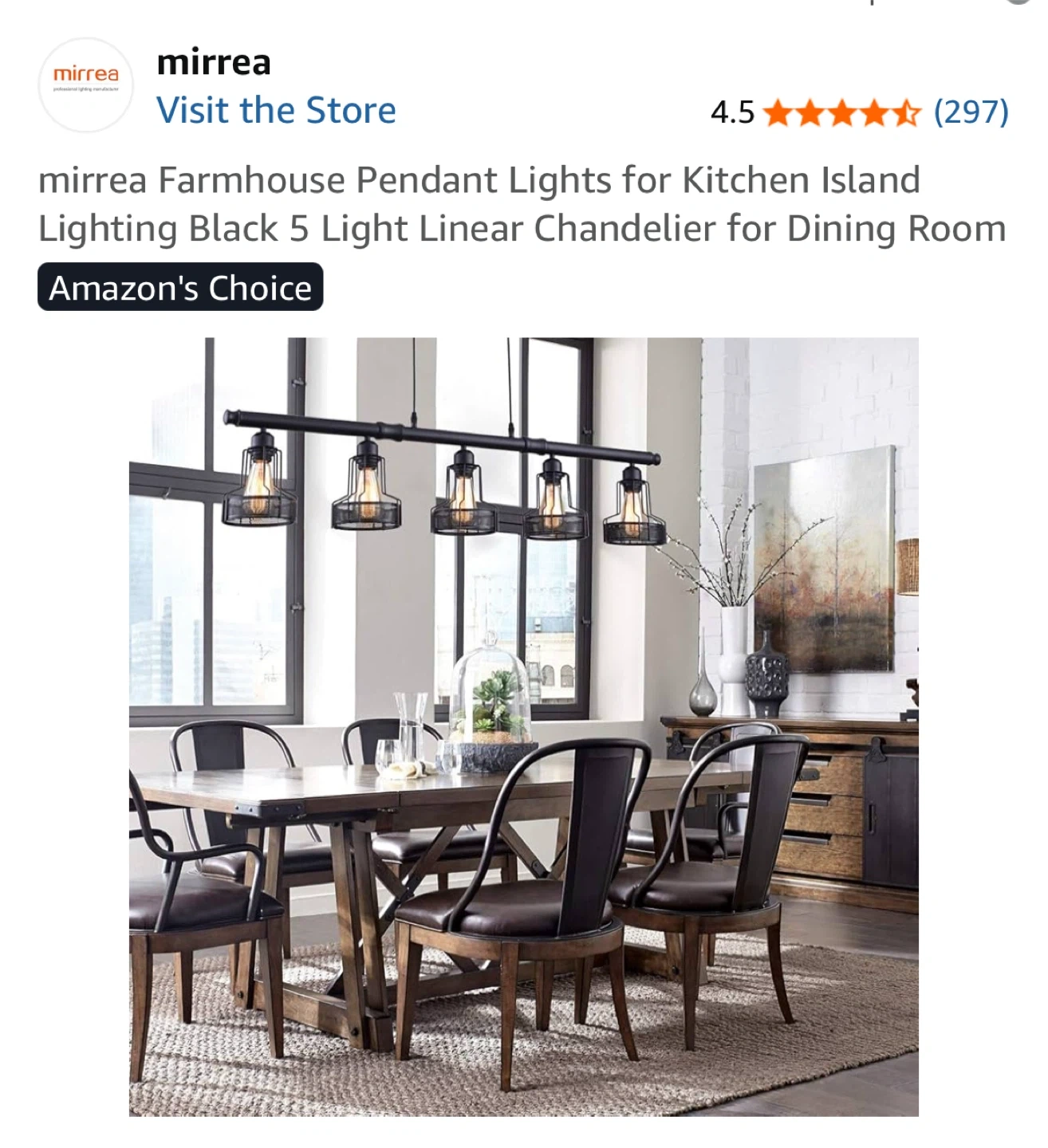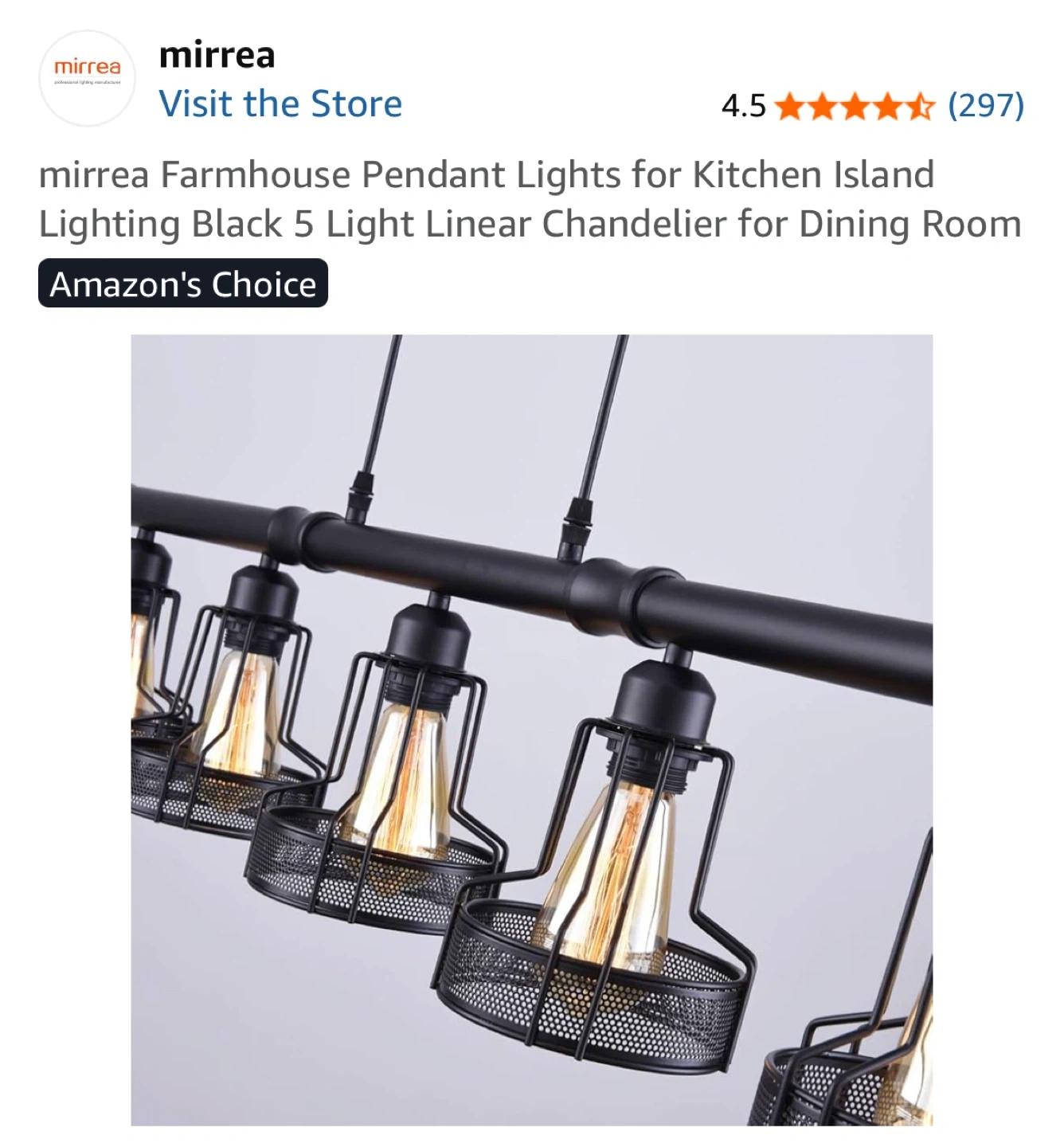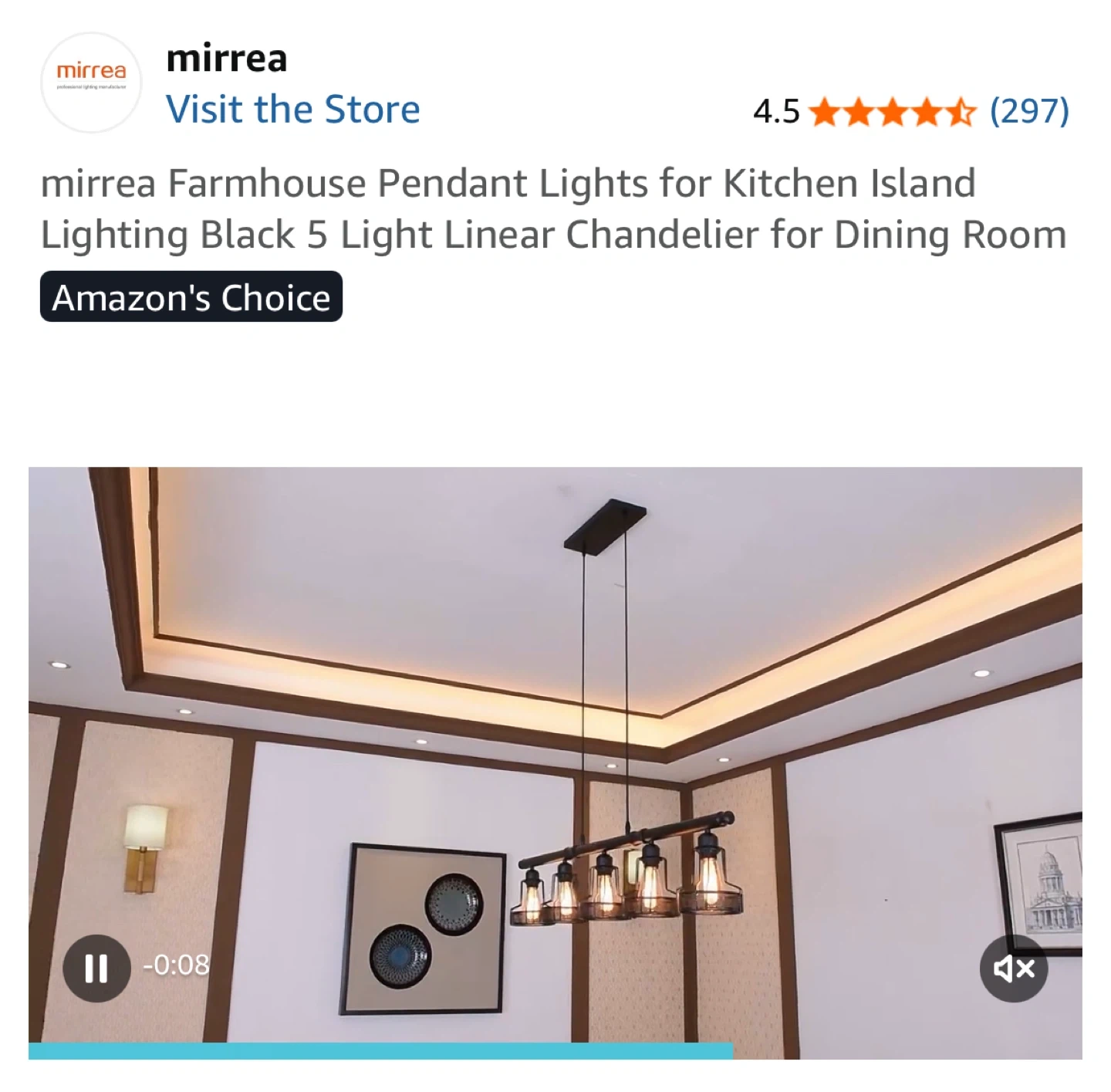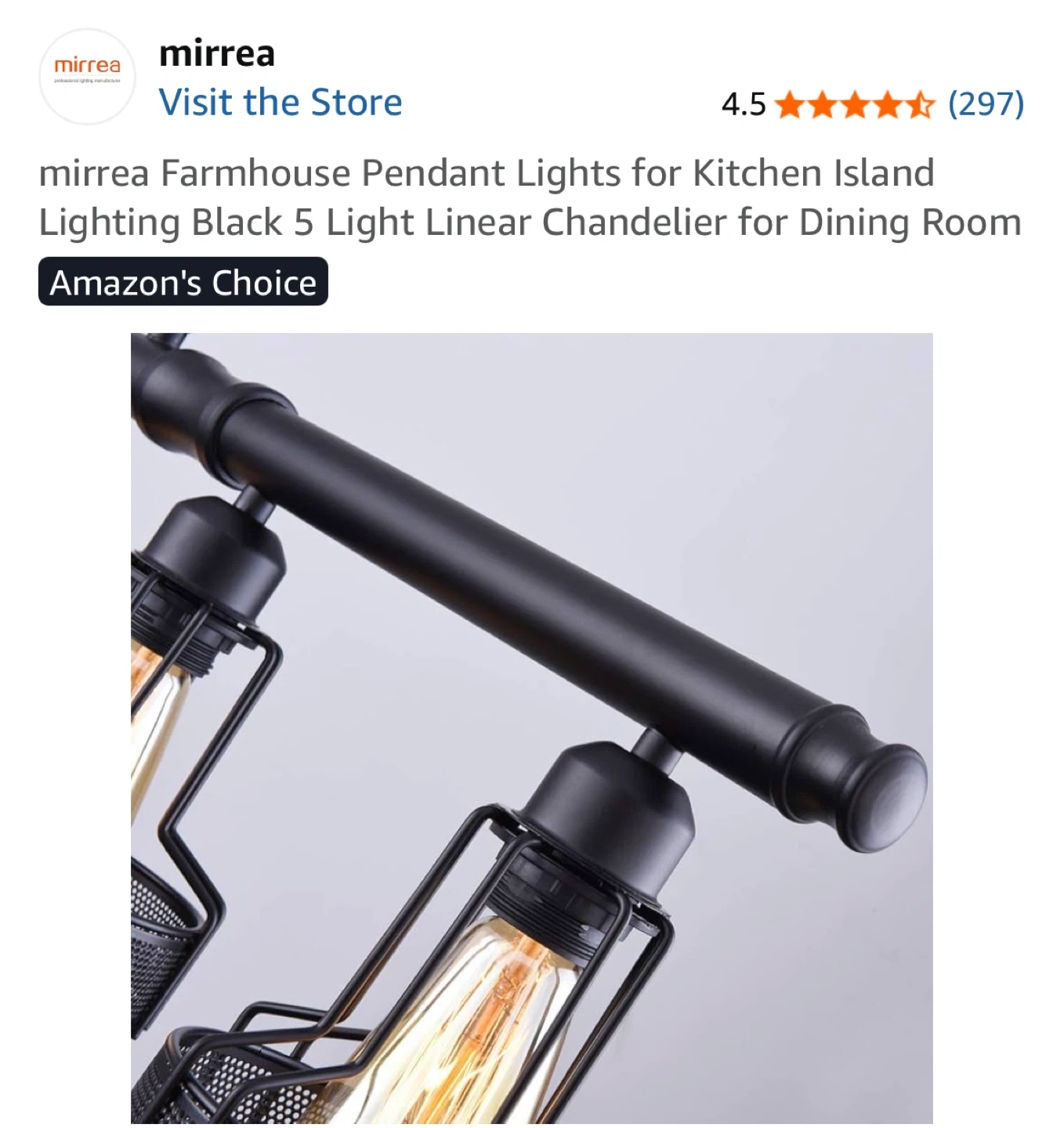 This is a Mirrea farmhouse pendant light, perfect for a kitchen island or dining room. It features a linear chandelier design with 5 lights in a stylish black finish. It's an Amazon's Choice item, so you know it's a great pick!