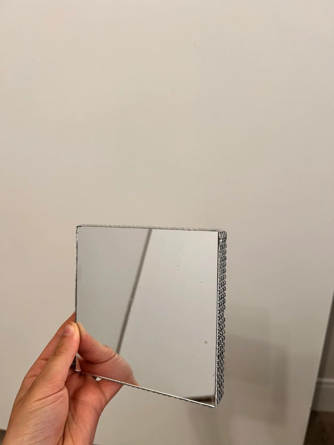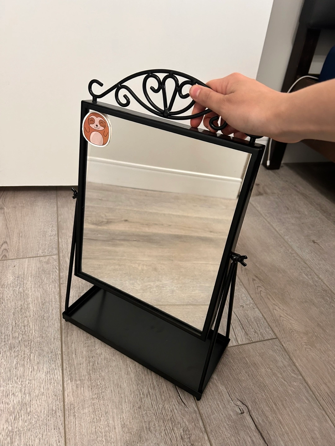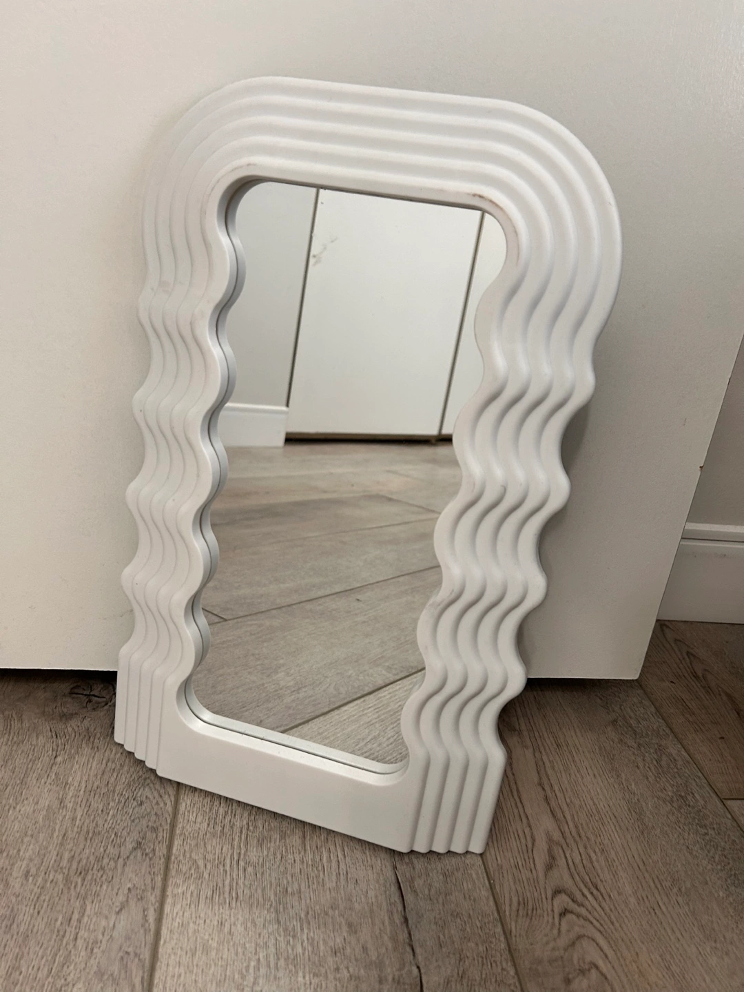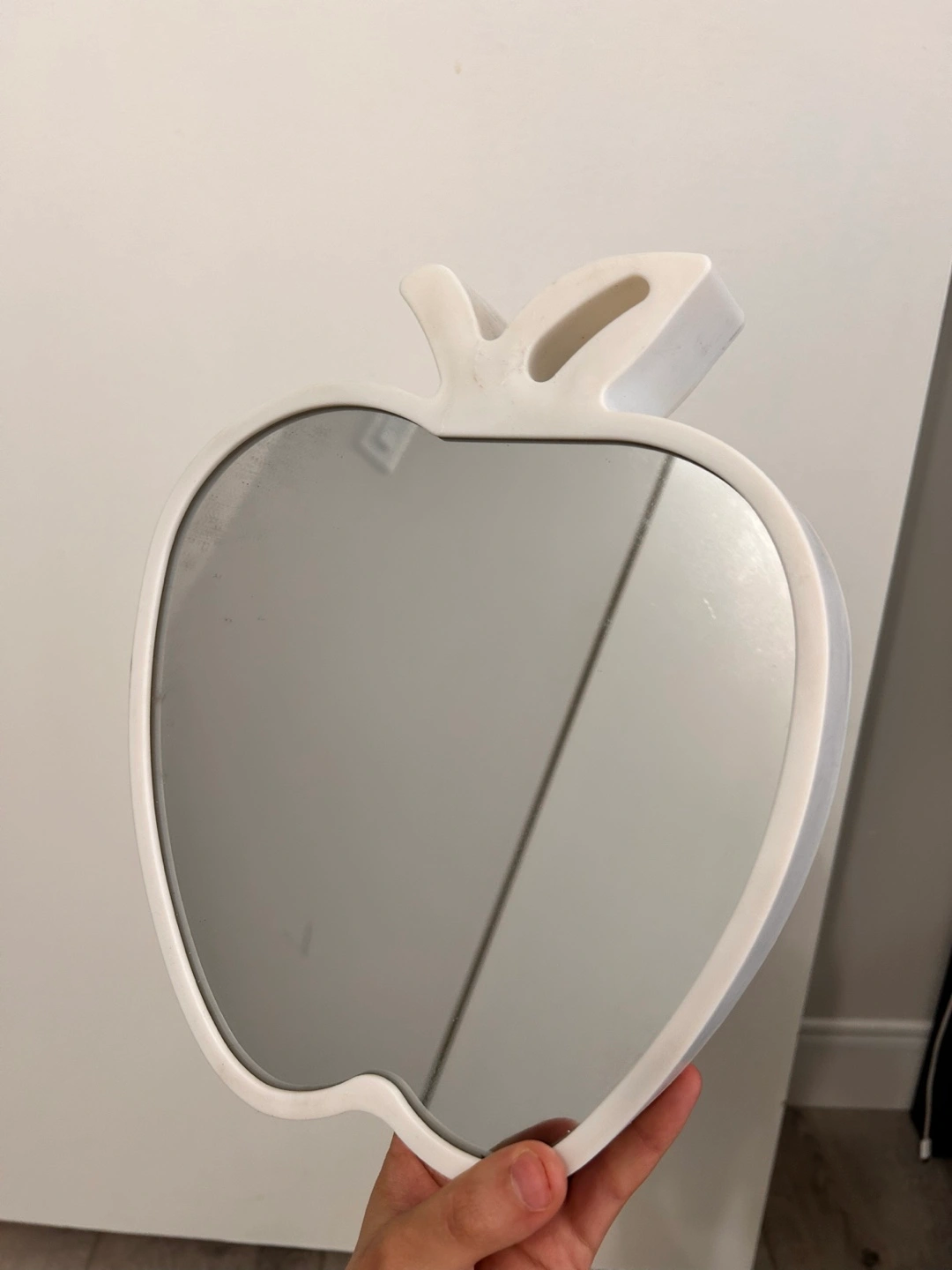 15One white plastic wavy mirror. $20 One white plastic apple-shaped mirror. $5 One small square mirror with silver beaded trim. $5 One black metal tabletop mirror with a small shelf. $20