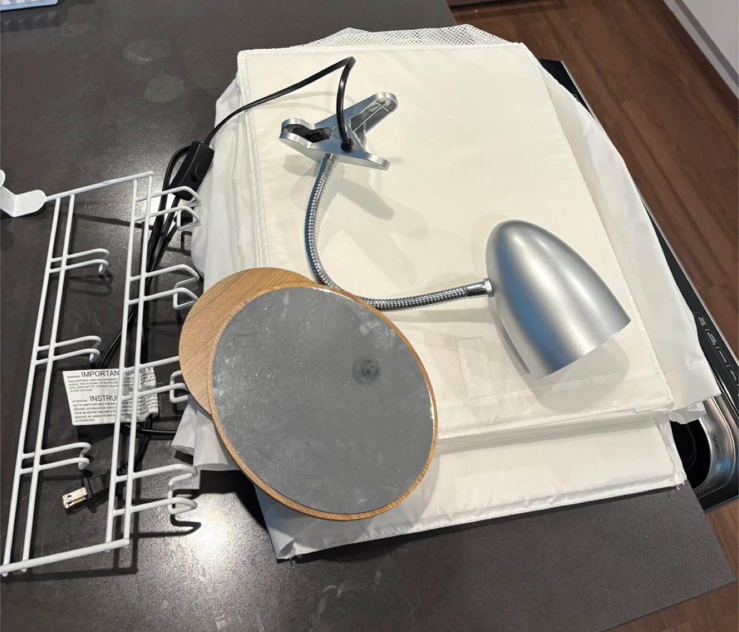 18ikea long closet organizer over the door 7 piece hanger LED clip on lamp for ur bed or desk travel mirror, good for getting ready but can also be kept completely flat all for 15
