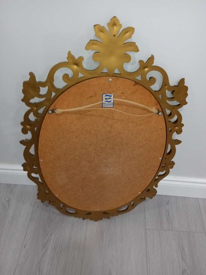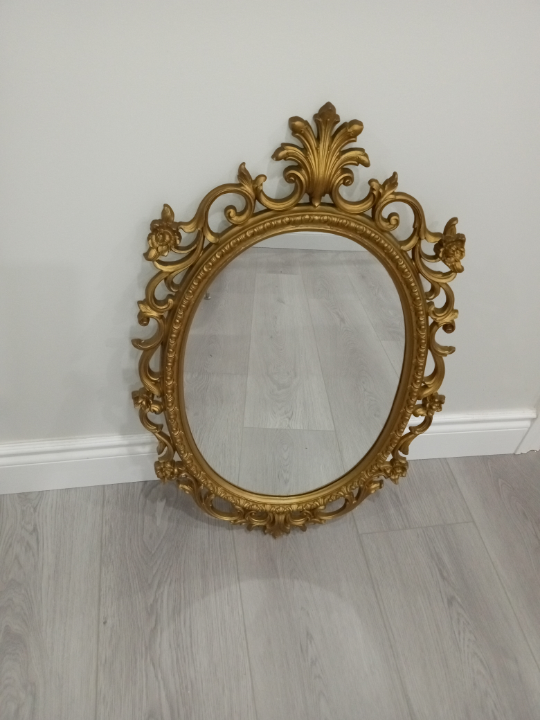 49Mirror measures 2.5 ft by 1.6 ft. Ornate gold colored but can be painted to suit your own decor. Great for hallway entrance or anywhere. Great condition and made in Canada.