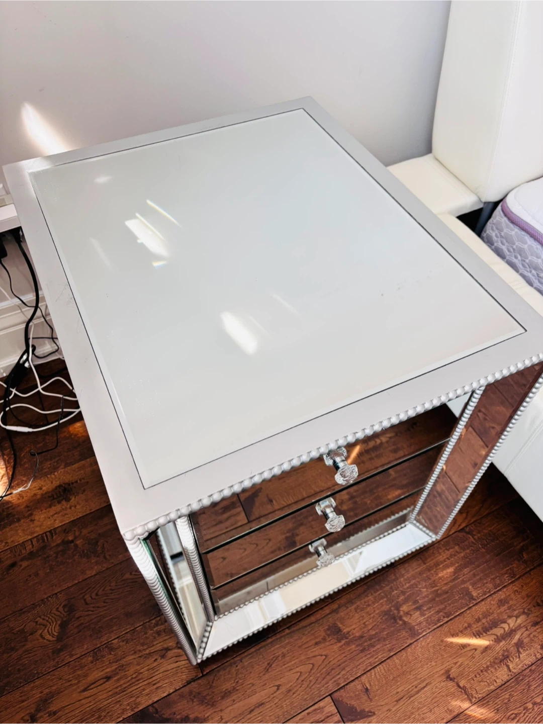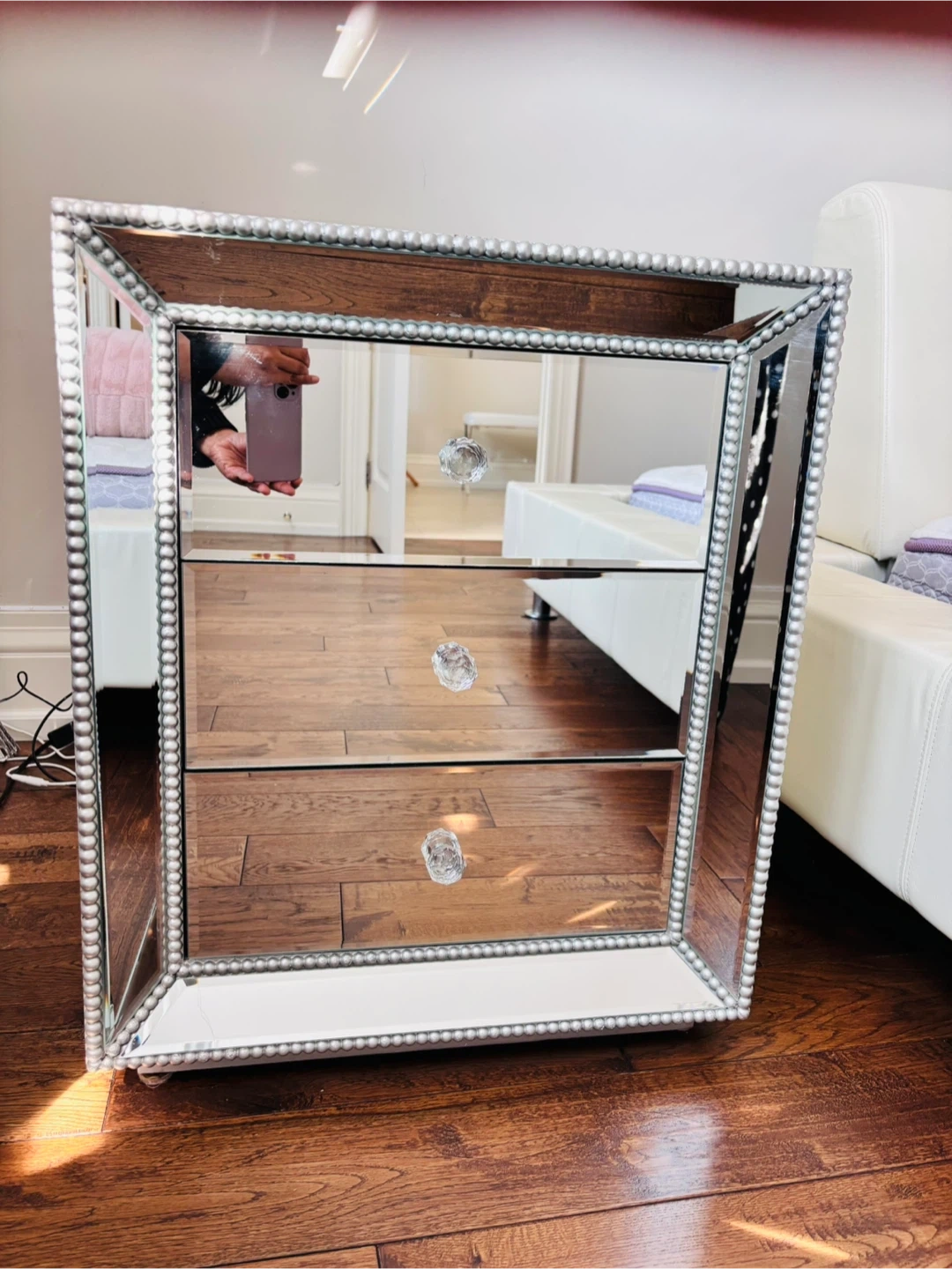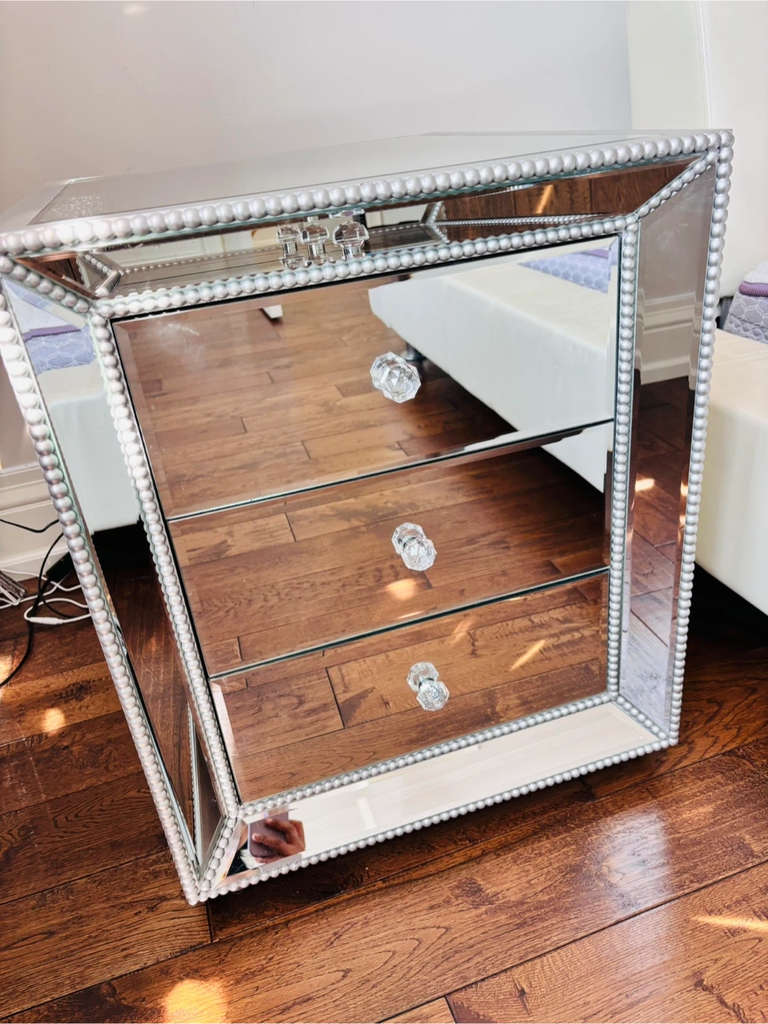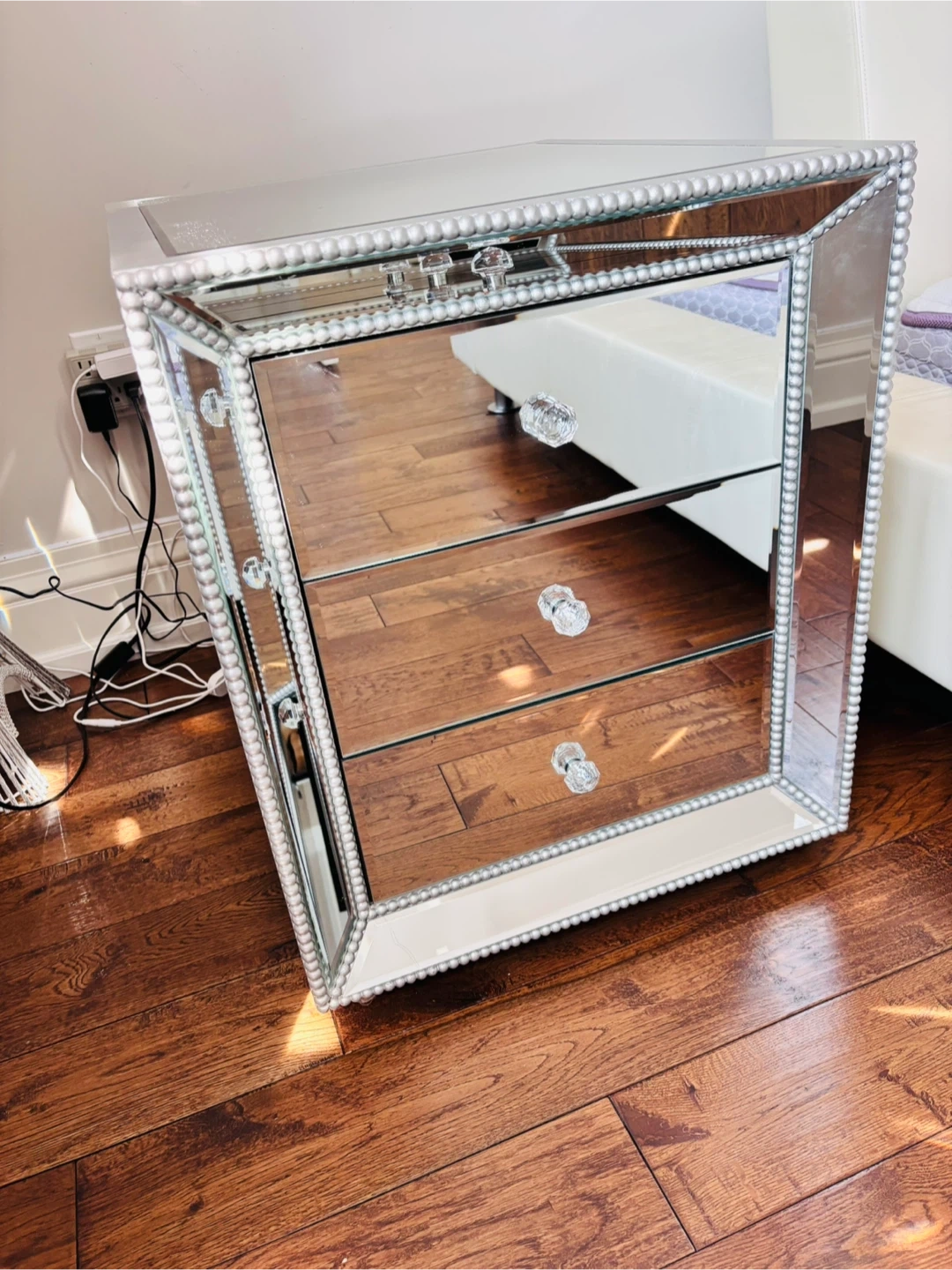 10Add a touch of glam to your space with this mirrored accent table! It features three drawers with crystal-like knobs, perfect for storing bedside essentials or living room accessories. The mirrored finish adds a bright and elegant look to any room
