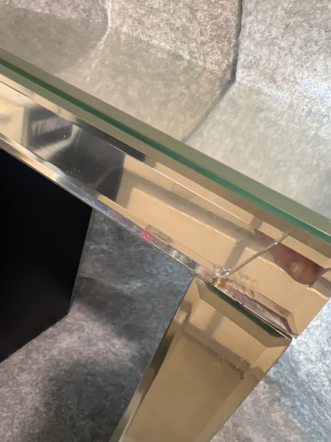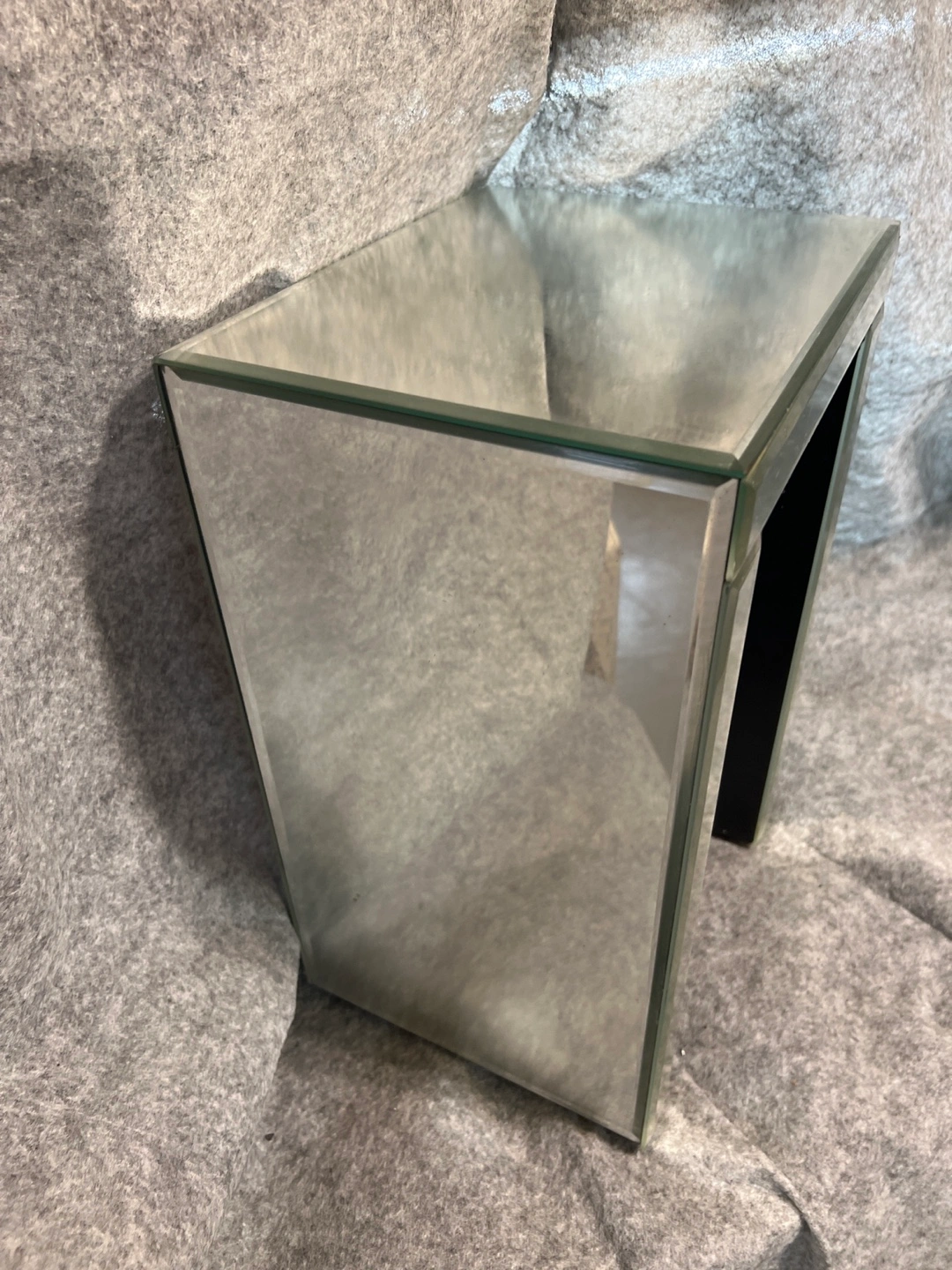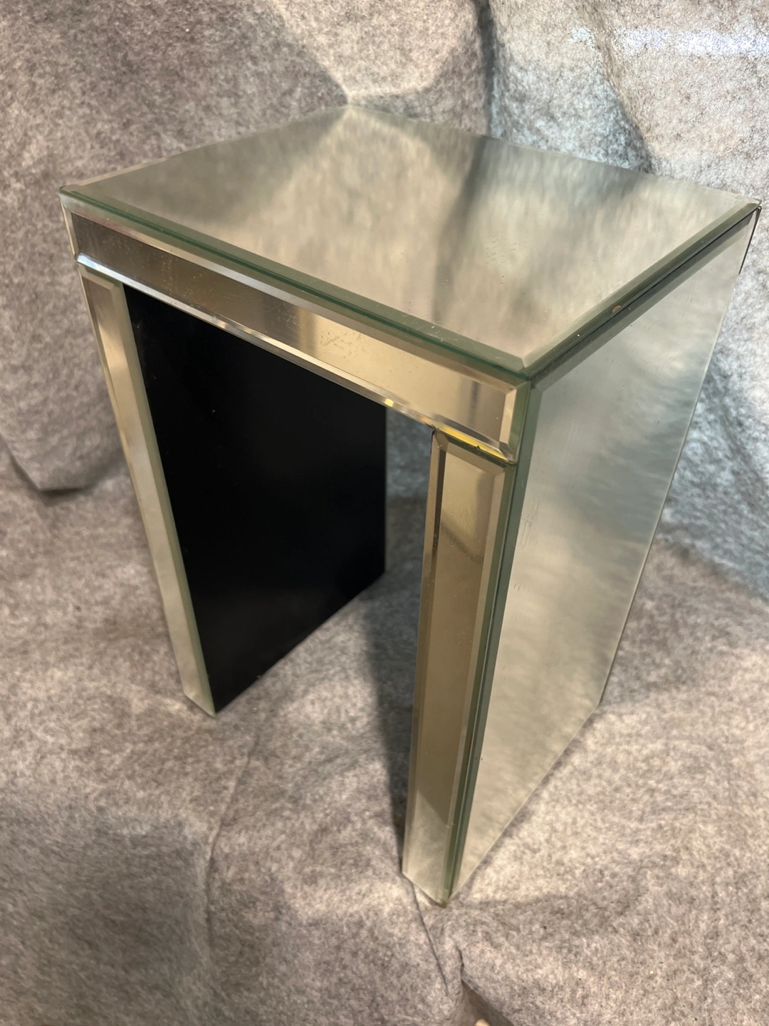 1000+Small crack in back top right. Mirrored accent table. Features a modern design with geometric shapes. It has a black interior. Place it beside your bed for a calming night stand.