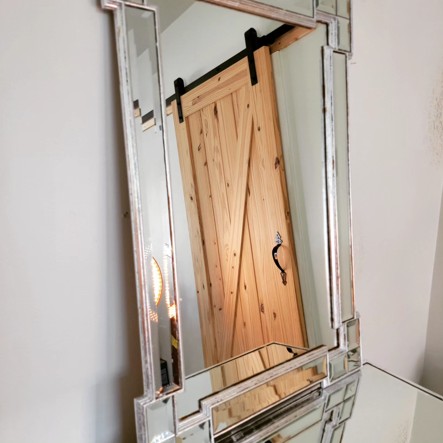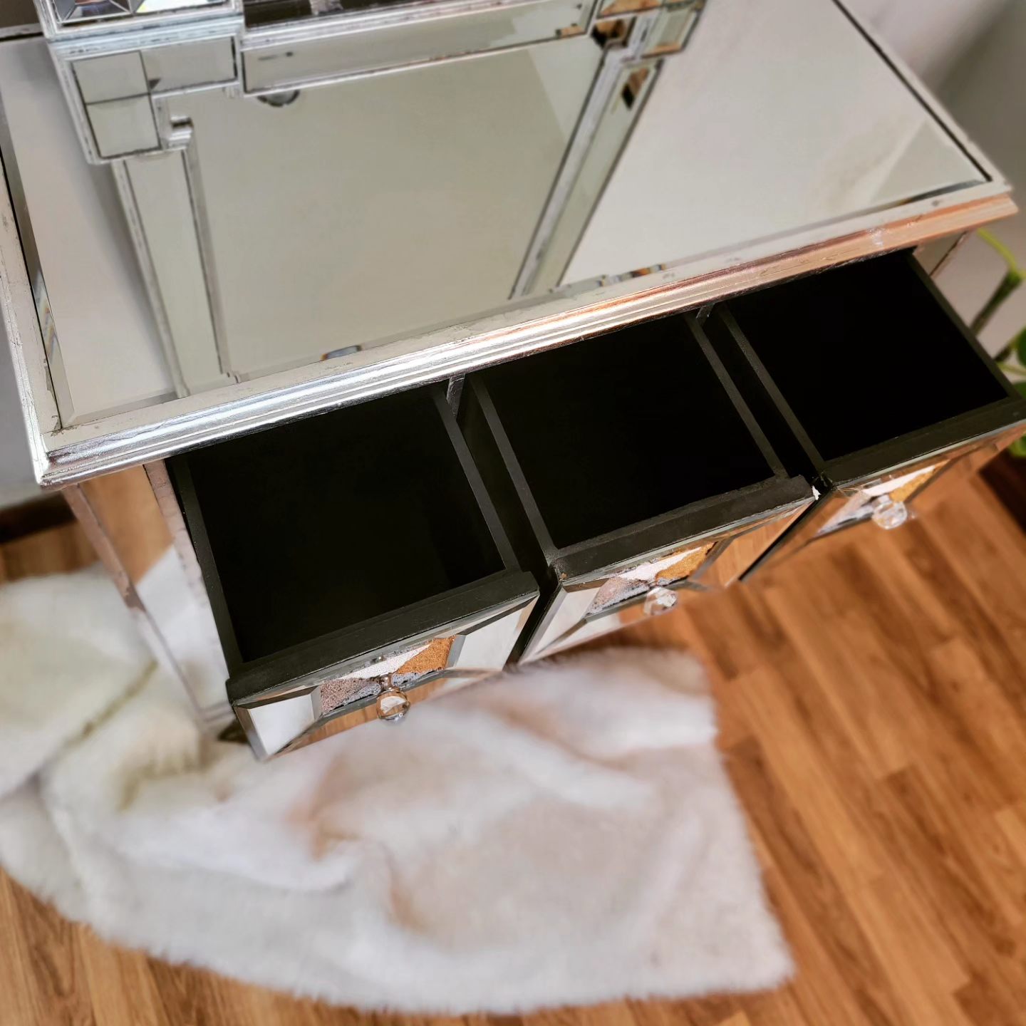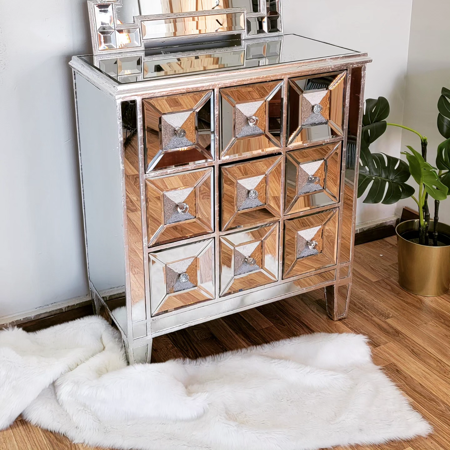 47Mirrored Chest Of Drawers and Mirror Set This fabulous Set features nine medium size functional drawers create useful storage. It has very nice design on front of drawers with hand cut beveled mirrored panels are finished with clear crystal handles that reflect light. This console comes with matching mirror makes it very unique when put in entry way or can be used as a dresser. ⚜️ Dimensions ⚜️ Mirror w 25 H 37 Mirror chest of drawers W 32 H 35 D16 ⚜️ Some of our pieces are antique or vintage, you will see signs of age which gives the piece more character. 🚛🚛 Local Delivery is available and pick up is in boundary road https://instagram.com/antika_vintage_furniture?igshid=NDk5N2NlZjQ=