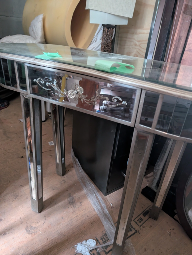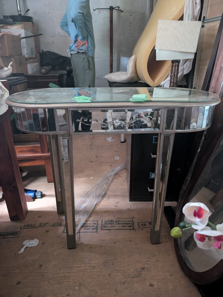 Selling a mirrored console table. It's in great condition and would look lovely in an entryway or living room. The mirrored finish adds a touch of elegance and reflects light beautifully, making any space feel brighter and more open, a little chip on the back