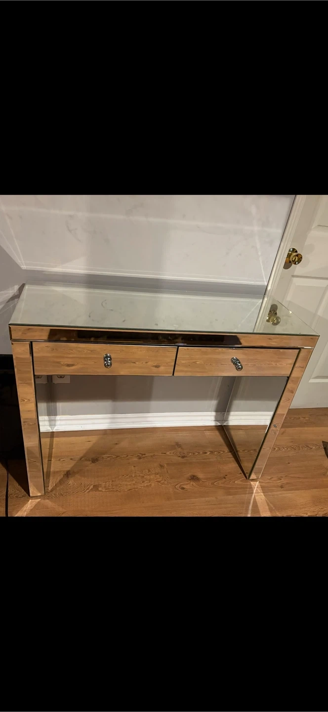 10Selling a mirrored console table. It features two drawers and has a sleek, modern look. Perfect for an entryway or living room!