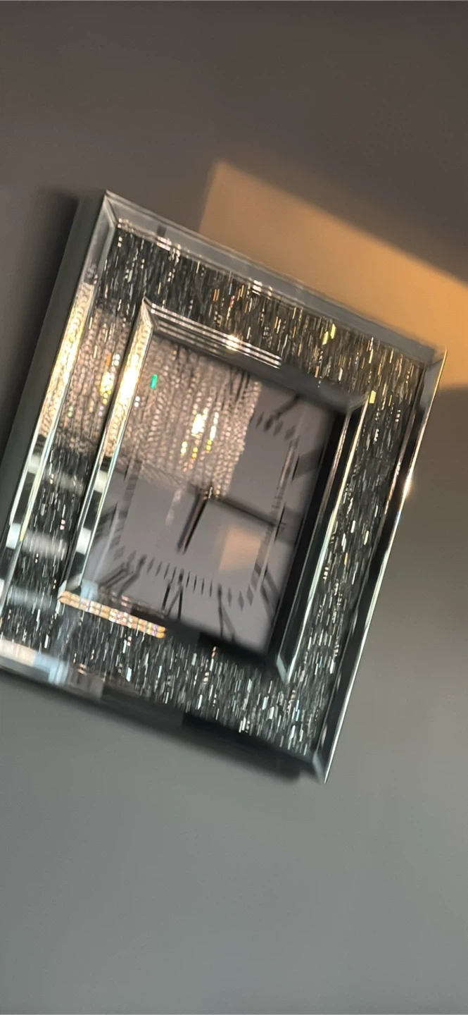 Selling a lovely mirrored wall clock with a diamond crush effect around the frame. It's a beautiful piece to add a touch of sparkle to any room!