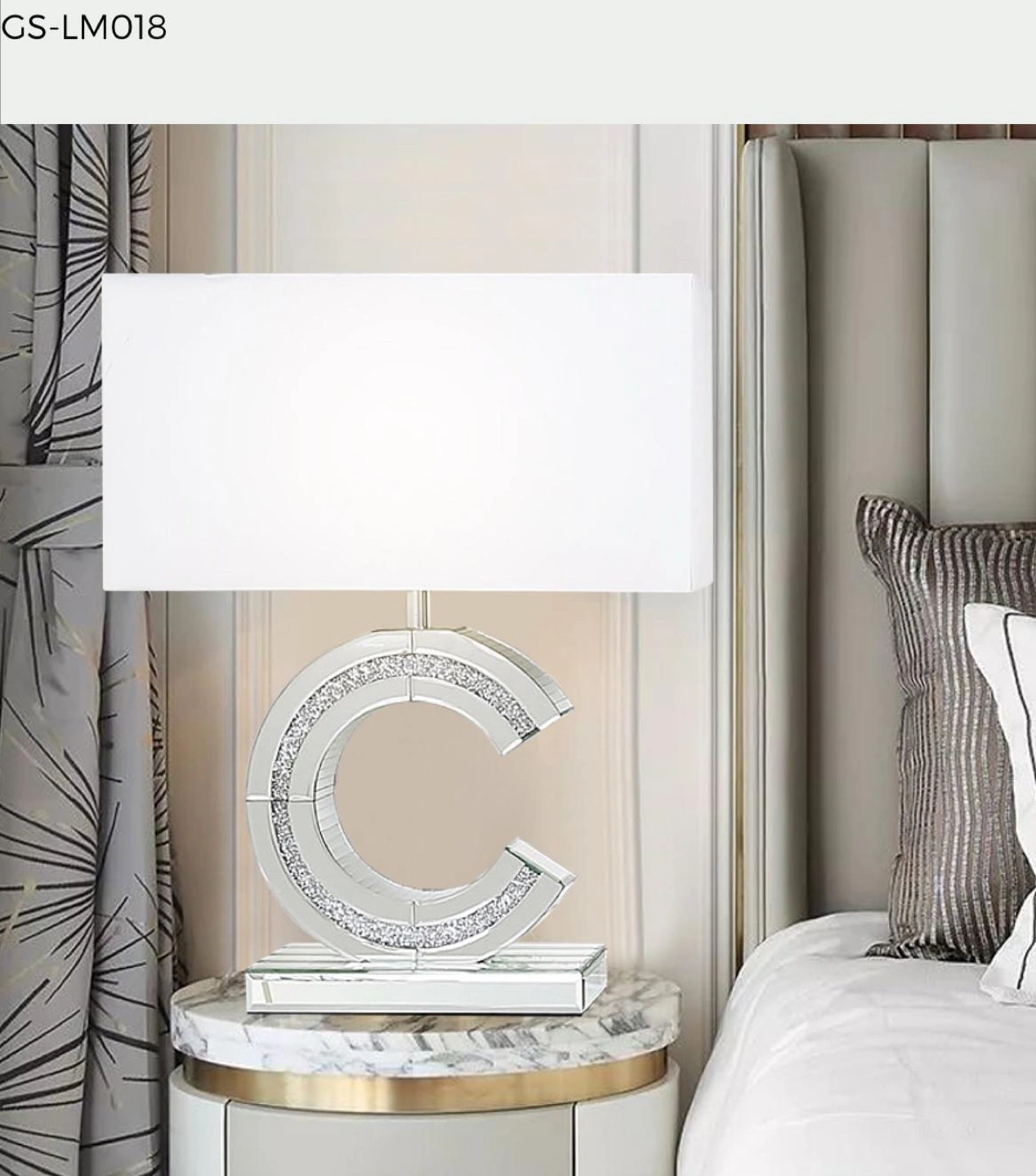 21Table lamp with a mirrored base shaped like a letter C with crystal accents. The lamp comes with a white fabric lampshade.