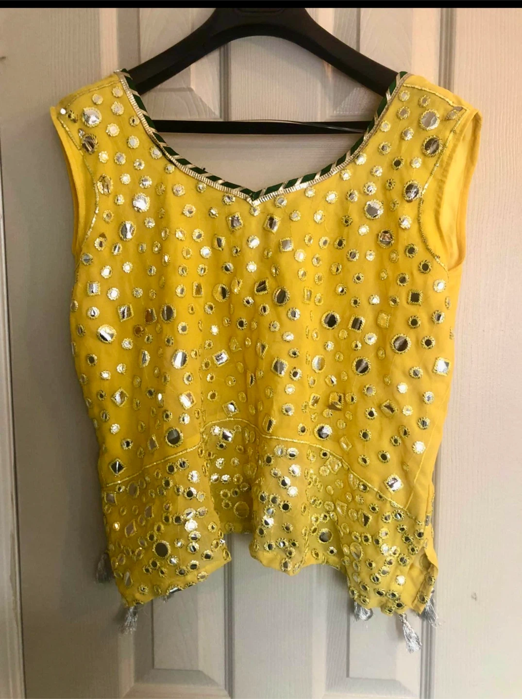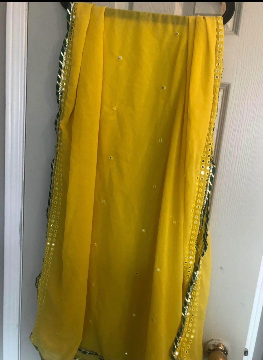 Selling a 3 piece Indian yellow lengha/choli outfit with mirrorwork detailing! It's a vibrant and unique piece, perfect for special occasions or adding a pop of colour to your wardrobe