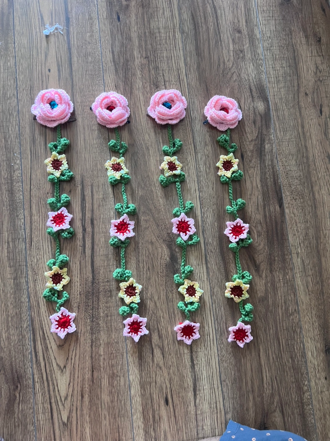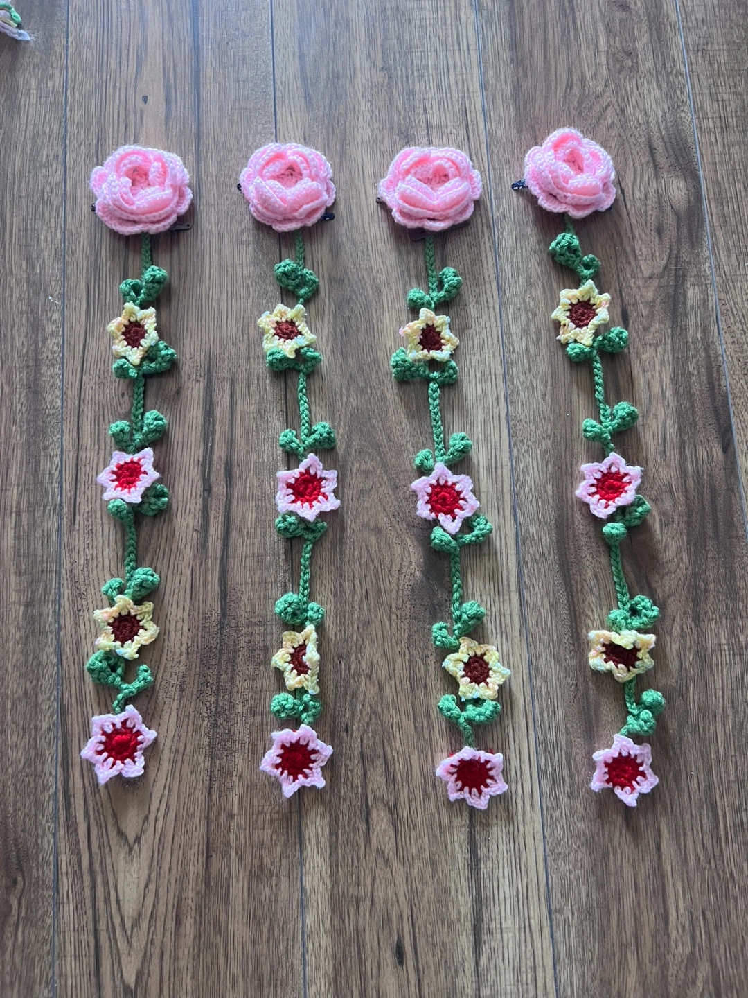 Selling a handmade crocheted flower hair clip . It features a string of colourful crocheted flowers in pink, yellow, and red with green leaves. Perfect for adding a touch of handmade charm to your hair for any occasion can be customised to length and as per request…