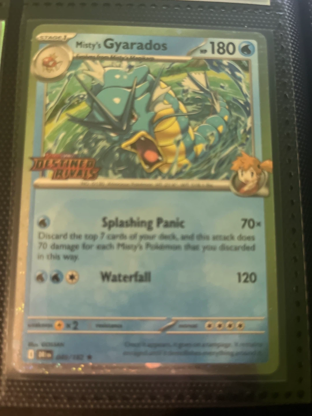 Selling a Misty's Gyarados Pokemon card. It's from the Destined Rivals set and has 180 HP. The card features the Splashing Panic attack, which does 70 damage and the Waterfall attack, which does 120 damage
