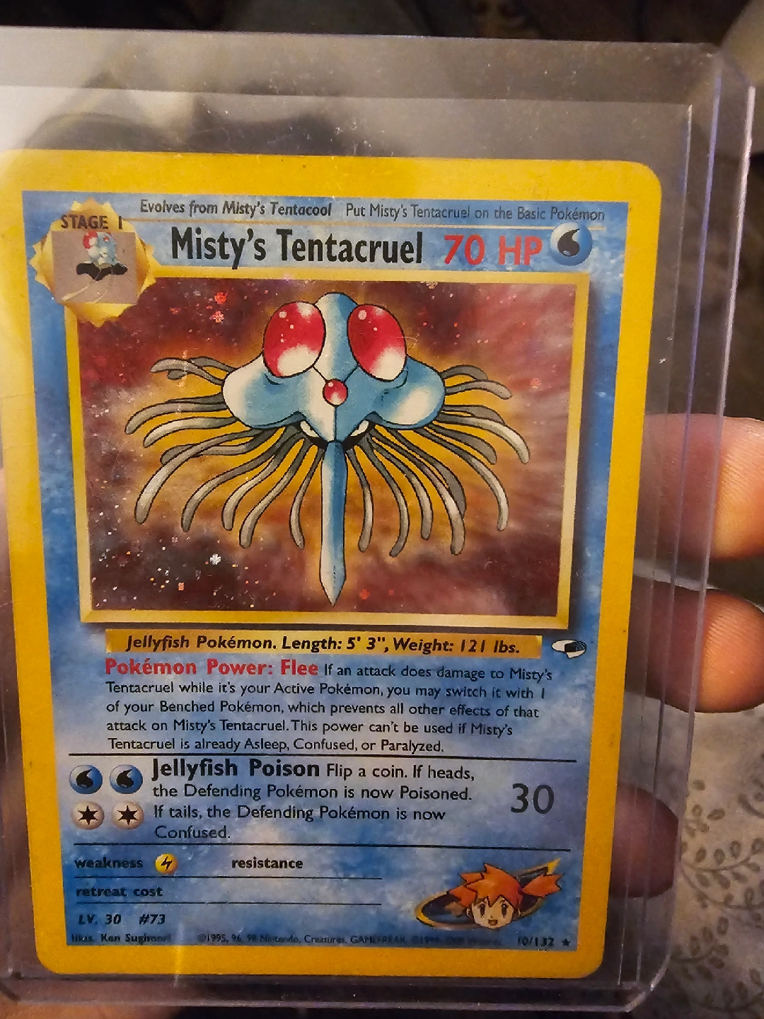 Selling a Misty's Tentacruel Pokemon card. It's a Stage 1 card that evolves from Misty's Tentacool. This Jellyfish Pokemon is 5' 3" in length and weighs 121 lbs. It has a Pokemon Power called Flee and an attack called Jellyfish Poison.