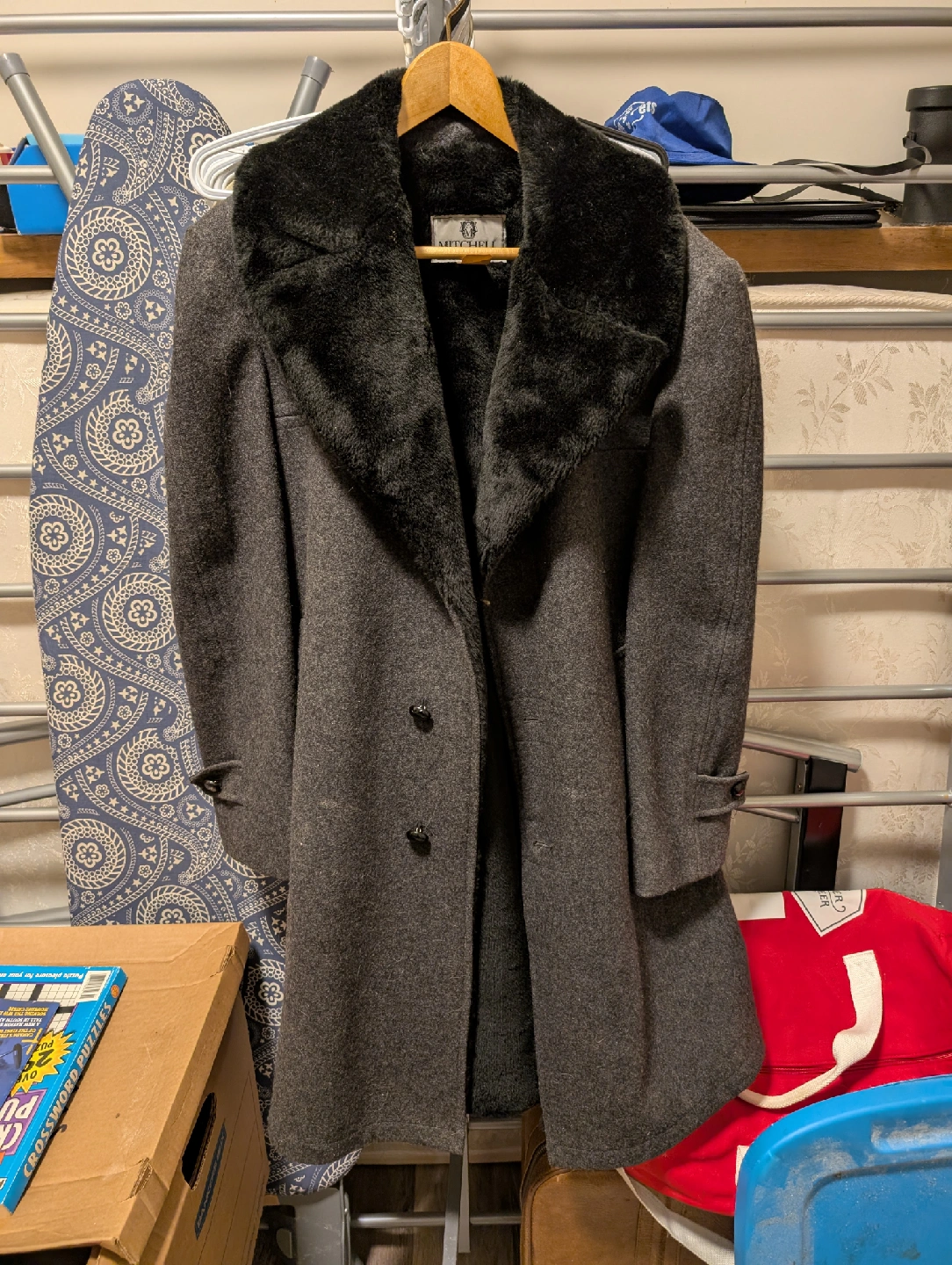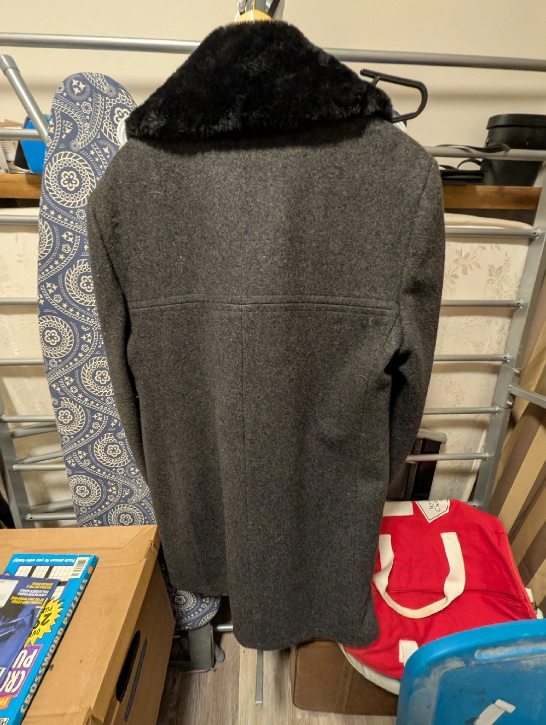 Selling a stylish grey wool coat from Mitchell! It features a cozy faux fur collar, perfect for those chilly Canadian days. The coat is in great condition and ready for a new home. A classic and warm addition to your wardrobe!