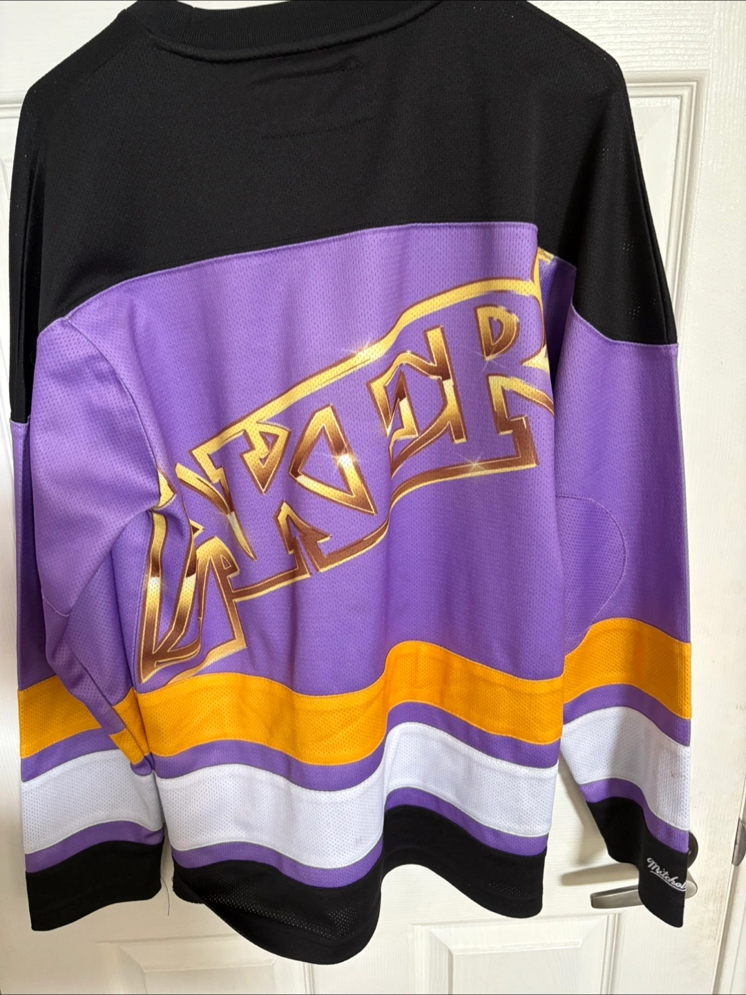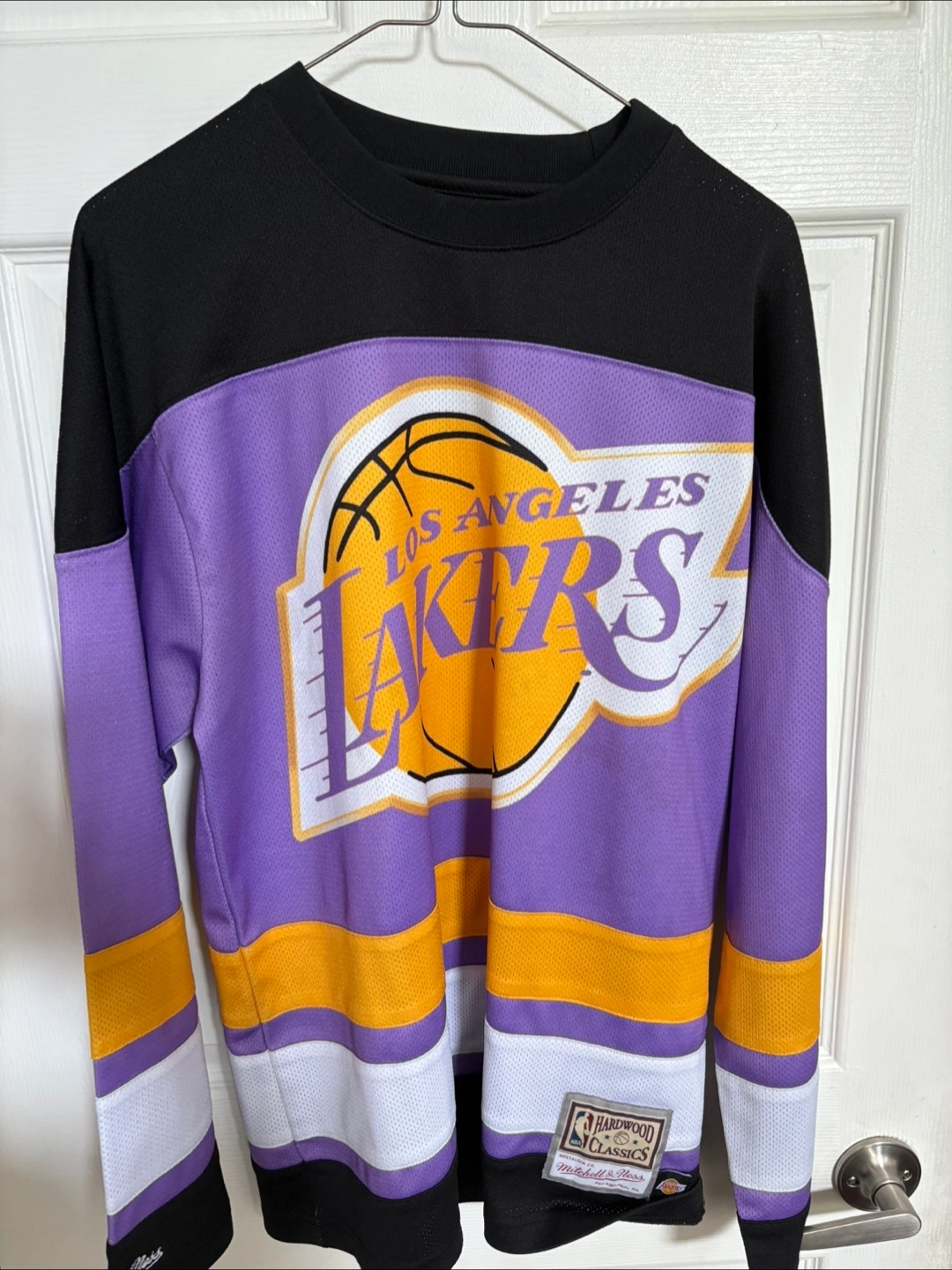 Selling an old Los Angeles Lakers hockey jersey by Mitchell & Ness. It's in great condition and features the classic Lakers colours. Perfect for any lakers fan!