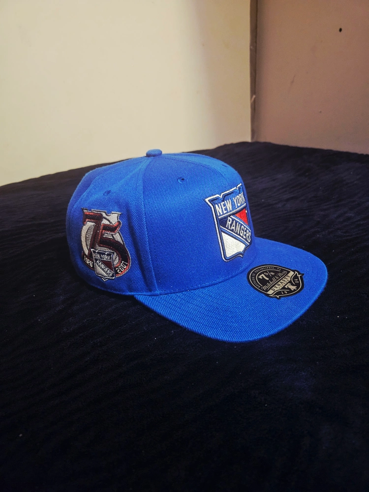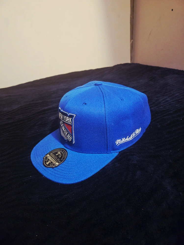 Selling a Mitchell & Ness New York Rangers hat in size 7 1/8. It's in great condition and features the classic Rangers logo and the NHL logo on the back. A stylish way to show your team pride!