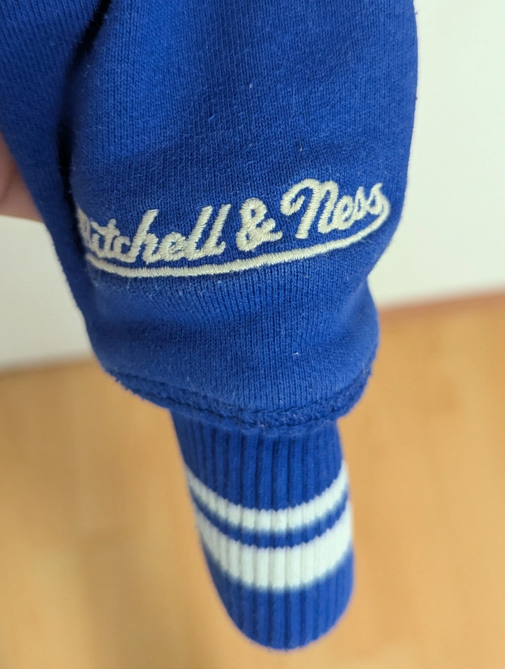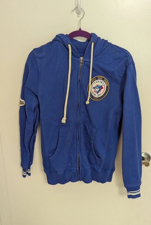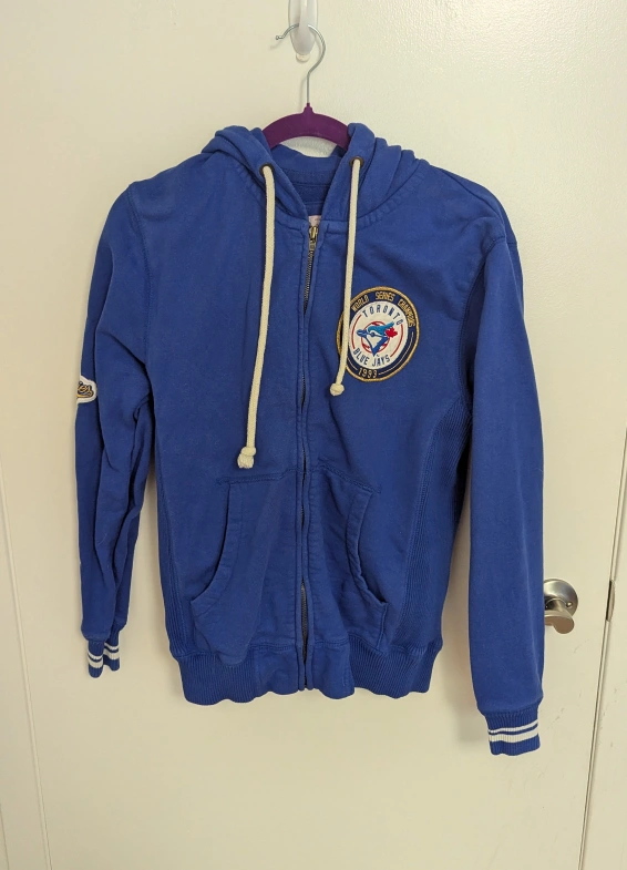 Selling a Mitchell & Ness Toronto Blue Jays hoodie. It's a full zip hoodie with the Blue Jays logo on the front and a World Series patch on the sleeve. Great for any Blue Jays fan!