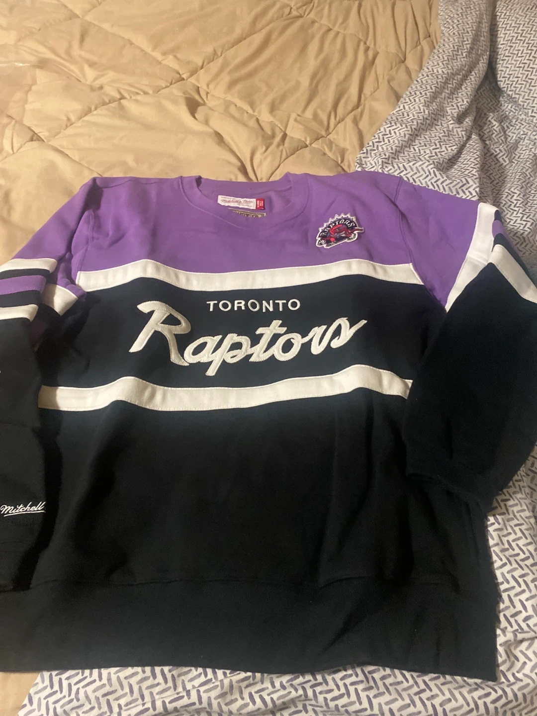 52Selling a Mitchell & Ness Toronto Raptors sweatshirt in size XL. The colours are purple, black, and white. It's in great condition and ready for a new home!