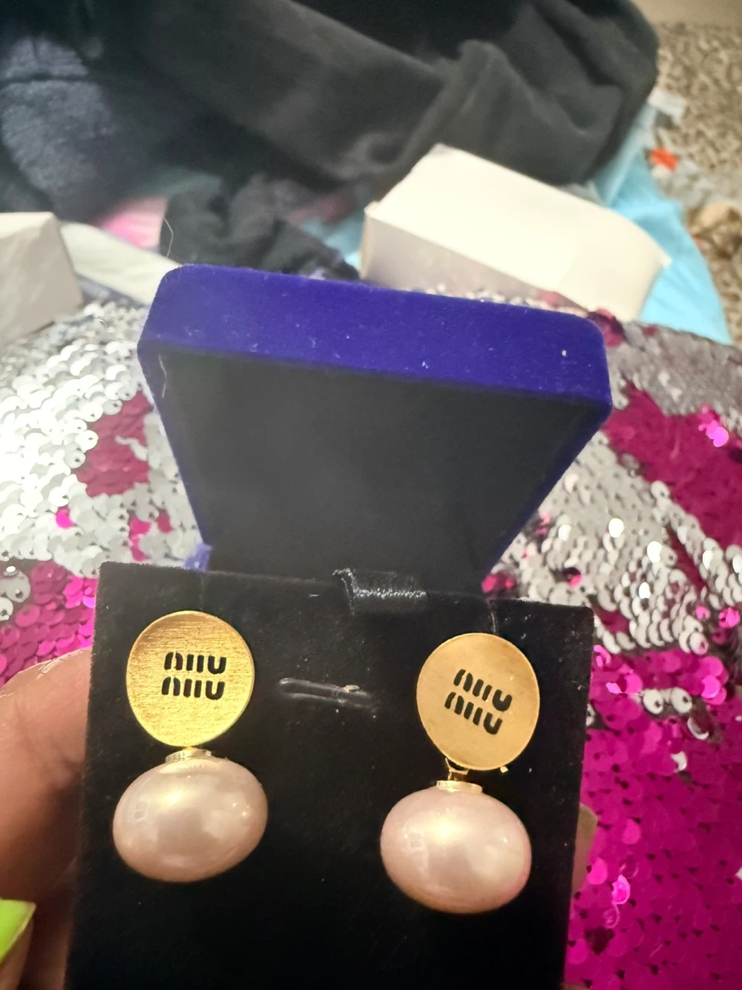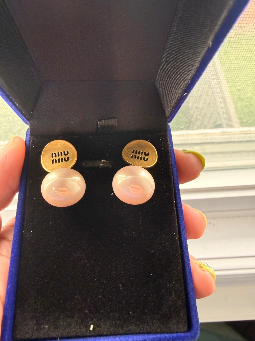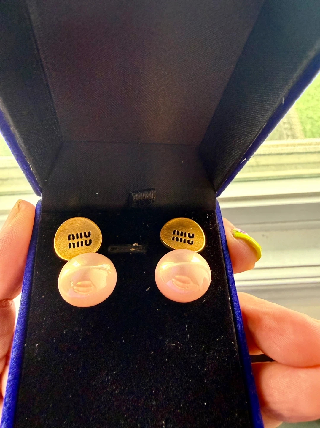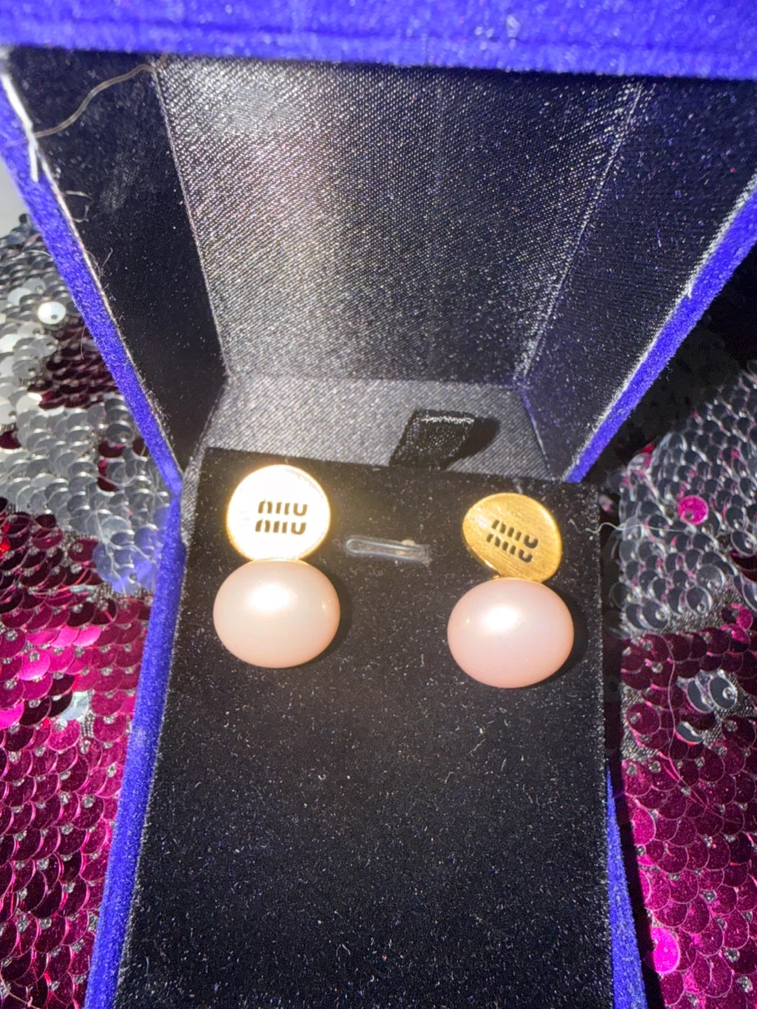 101These Miu Miu earrings are in great condition and come with their original box! They feature a gold-tone top with the Miu Miu logo and a beautiful pink pearl drop. Perfect for adding a touch of elegance to any outfit