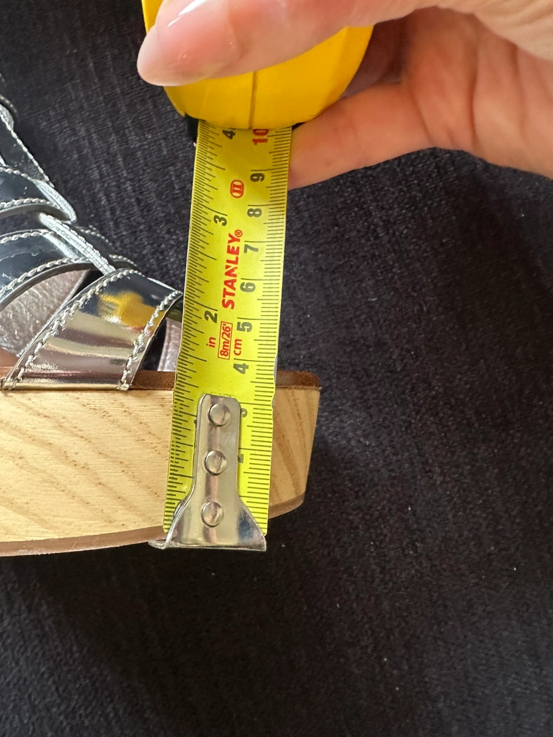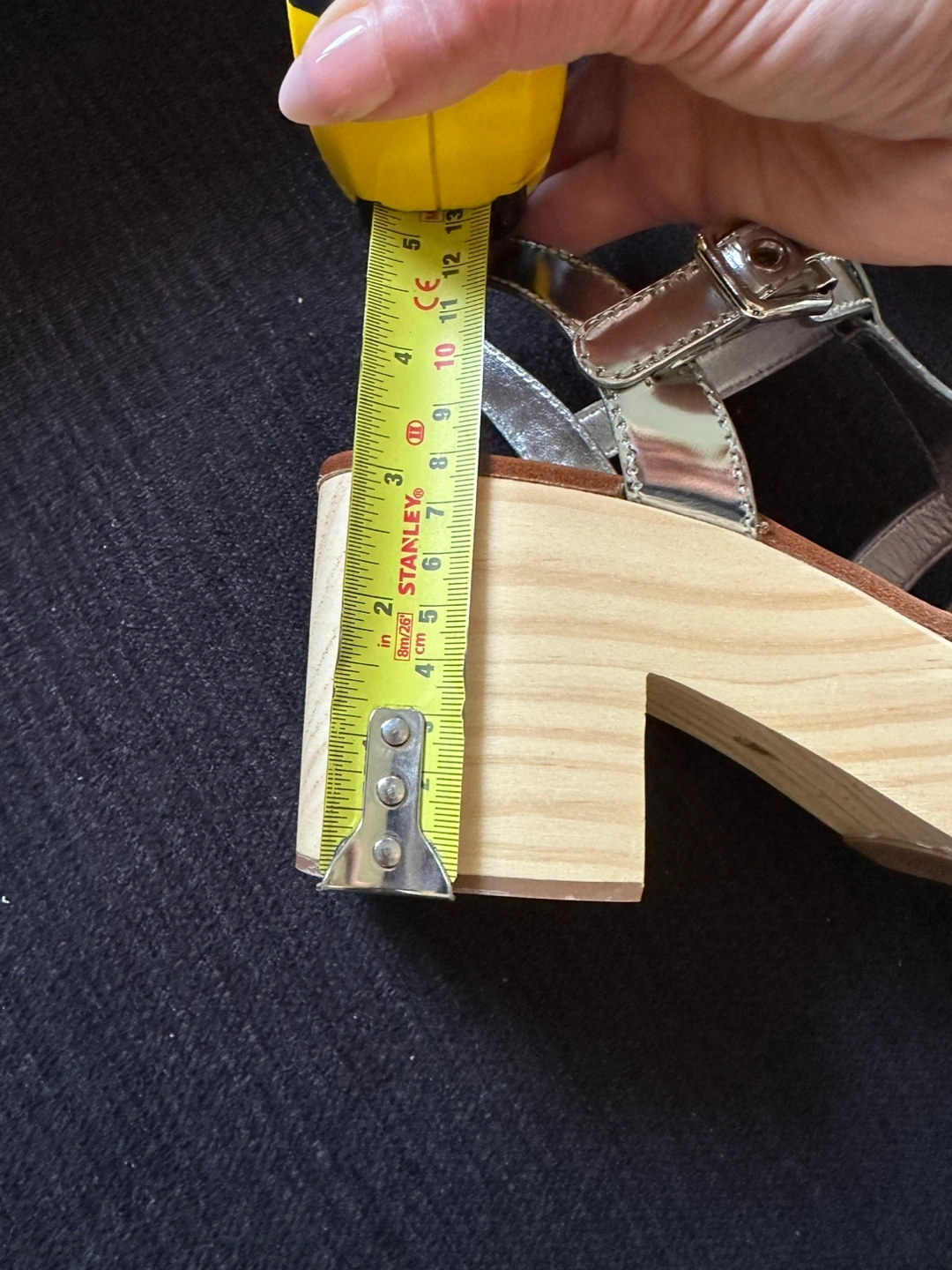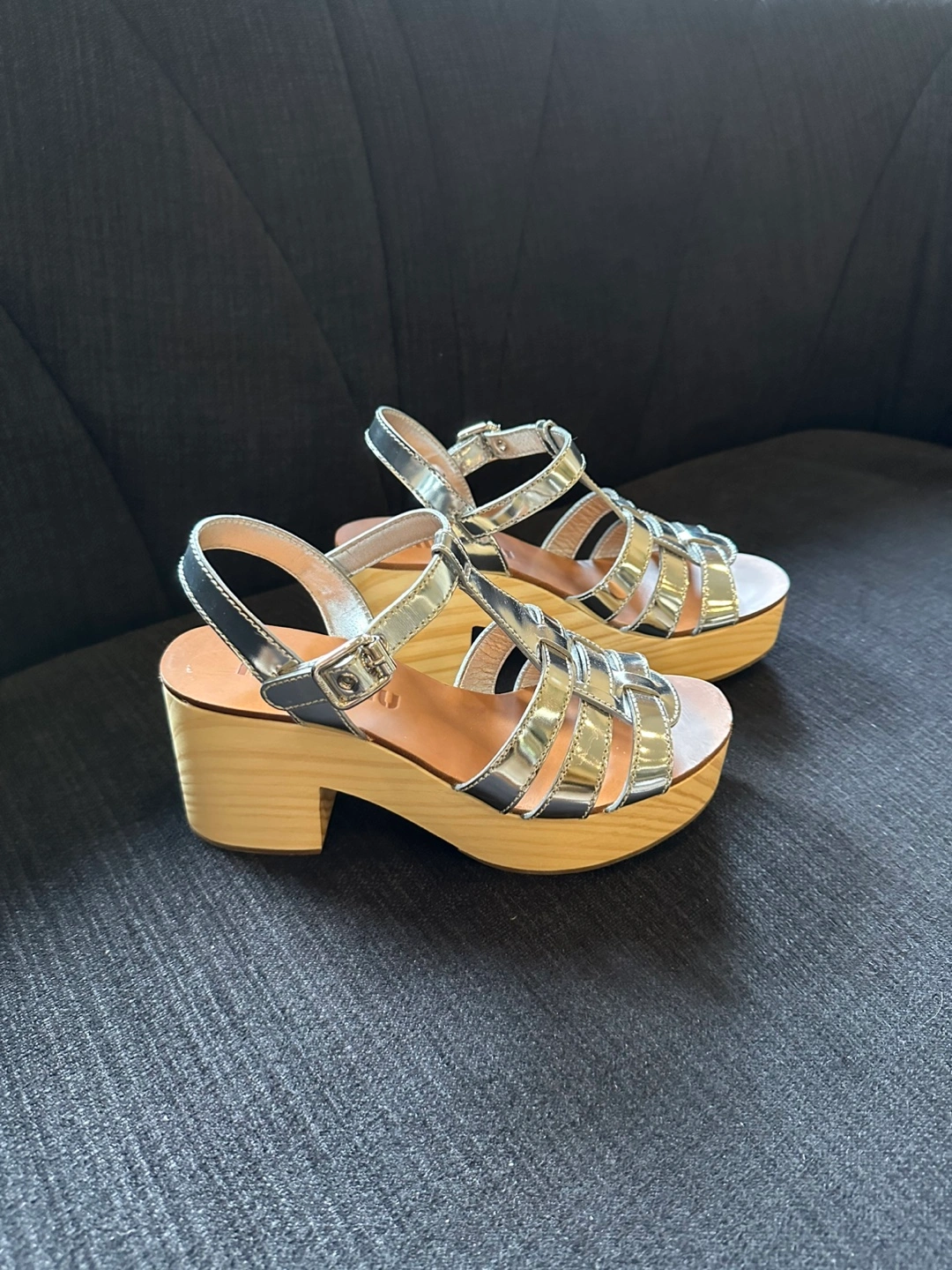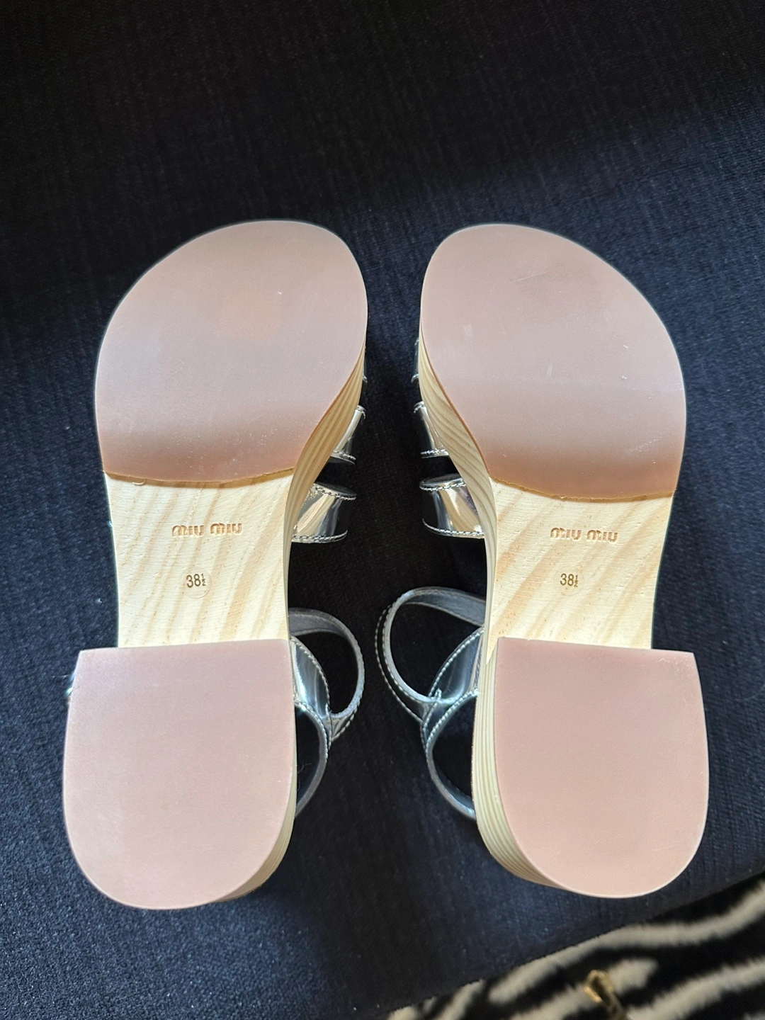 23These sandals are perfect for adding a touch of elegance to any outfit These gorgeous Miu Miu platform sandals are a stylish addition to any wardrobe! They feature a unique wooden block heel . The sandals are silver Size: 38.5 also fits : 38