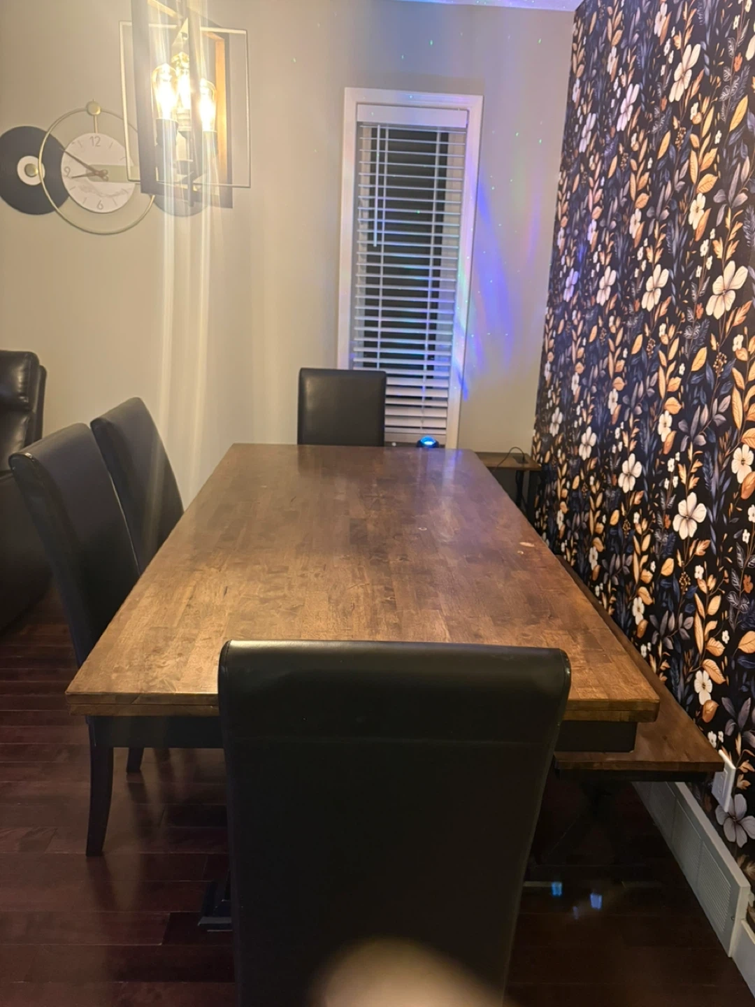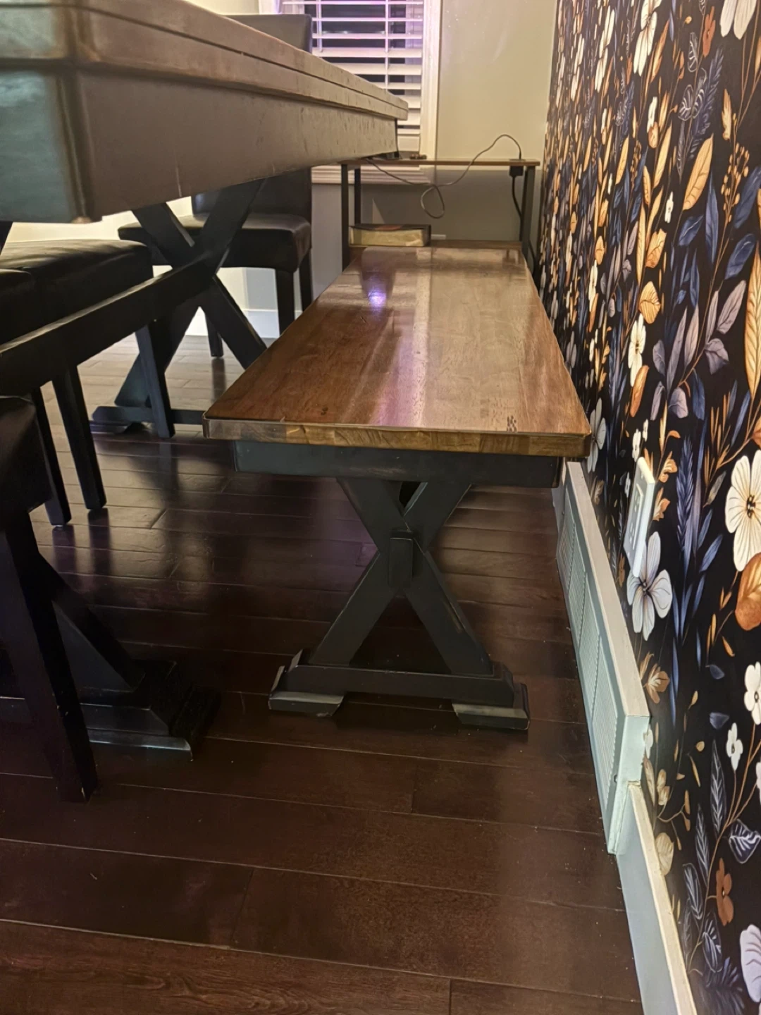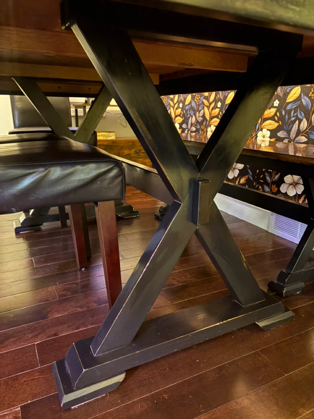 A sturdy wooden dining table featuring a rustic wood top and a black X-shaped leg base. It comes with a matching wooden bench as well as 4 faux brown leather chairs.