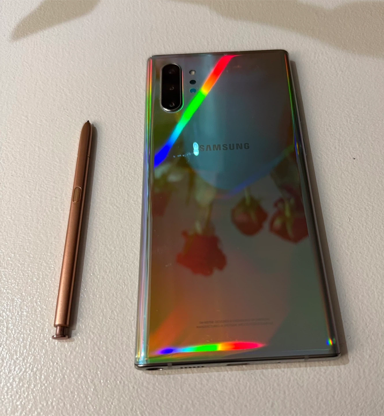 Samsung Galaxy Note 10+ smartphone in prism black. Includes S Pen and a black protective case. This phone's display is edge-to-edge and it features a versatile camera system.
