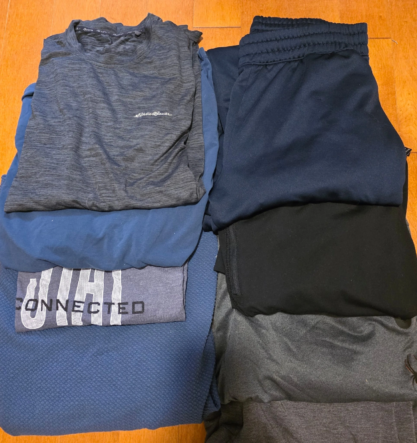 Selling a mix of shirts and pants in size medium to large! There are 4 shirts and 4 pairs of pants. The brands are mixed, so you'll get a variety of styles and materials. Perfect for everyday wear or workouts