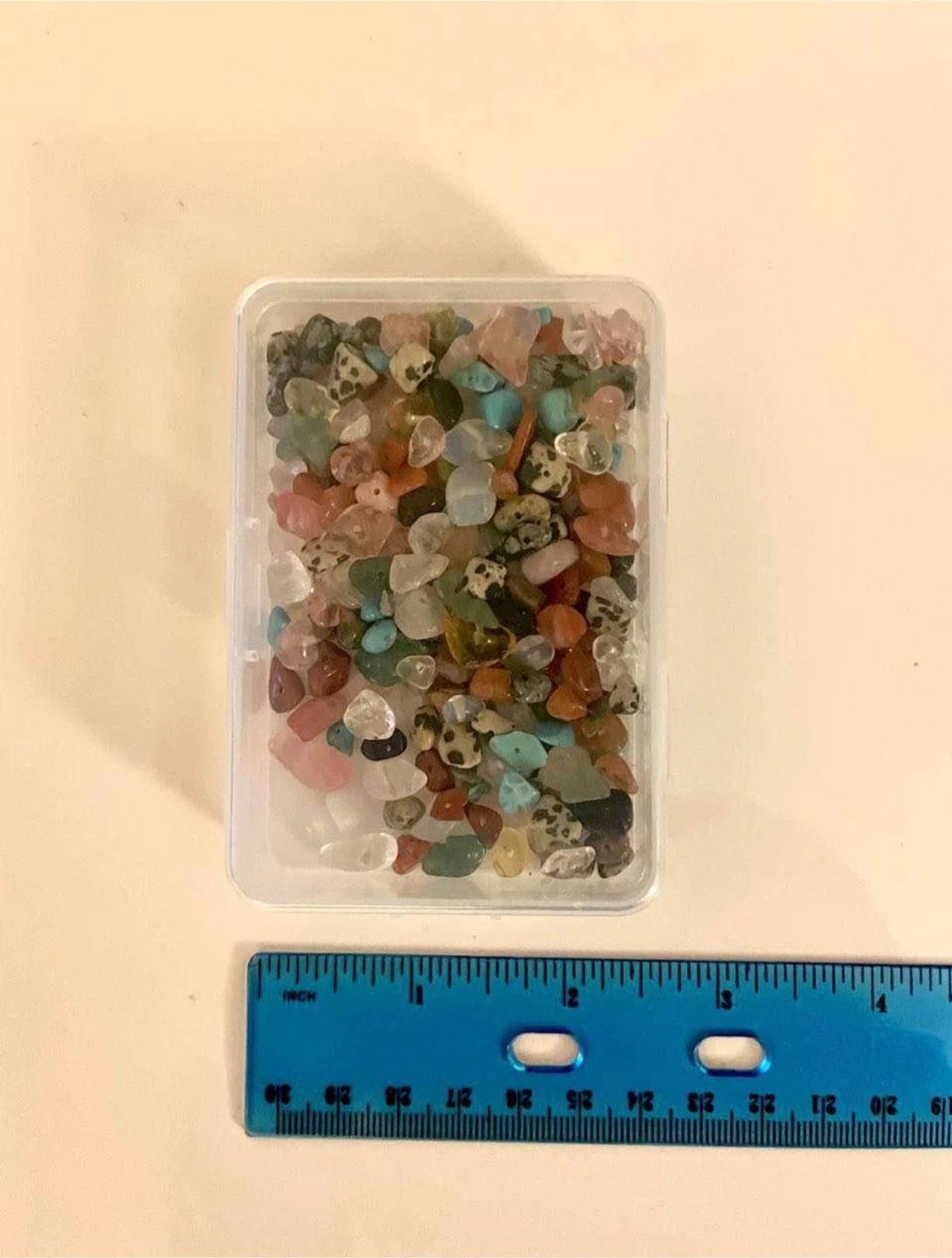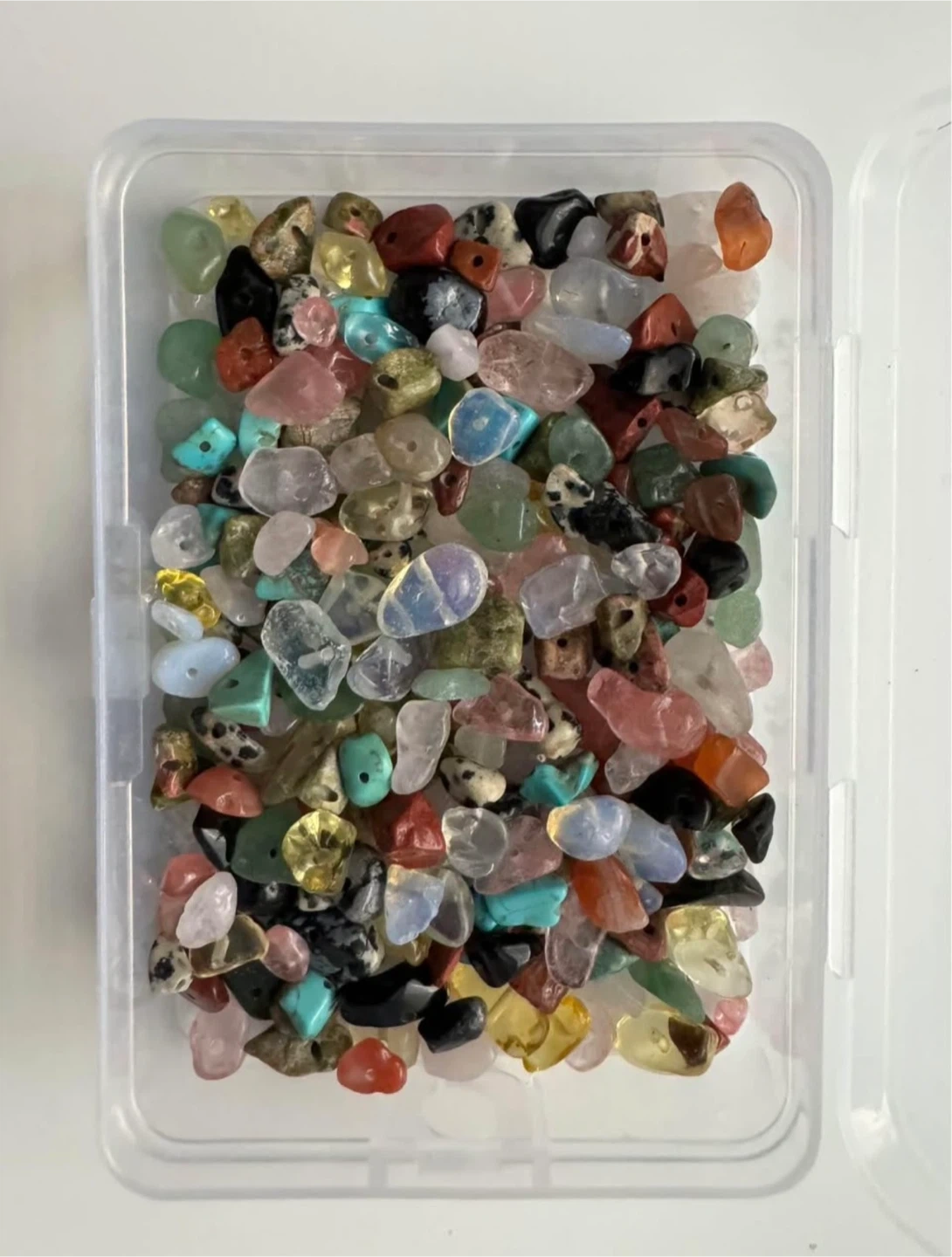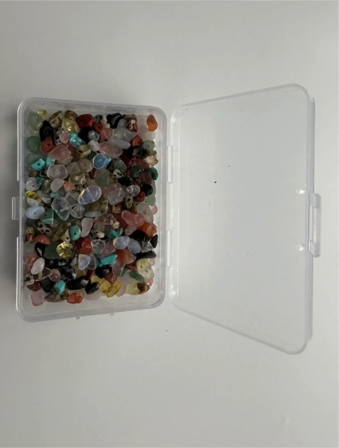 Selling a collection of mixed gemstone chips! These colourful stones are perfect for crafts, jewelry making, or decoration. They come in a handy plastic storage box for easy organization and access.