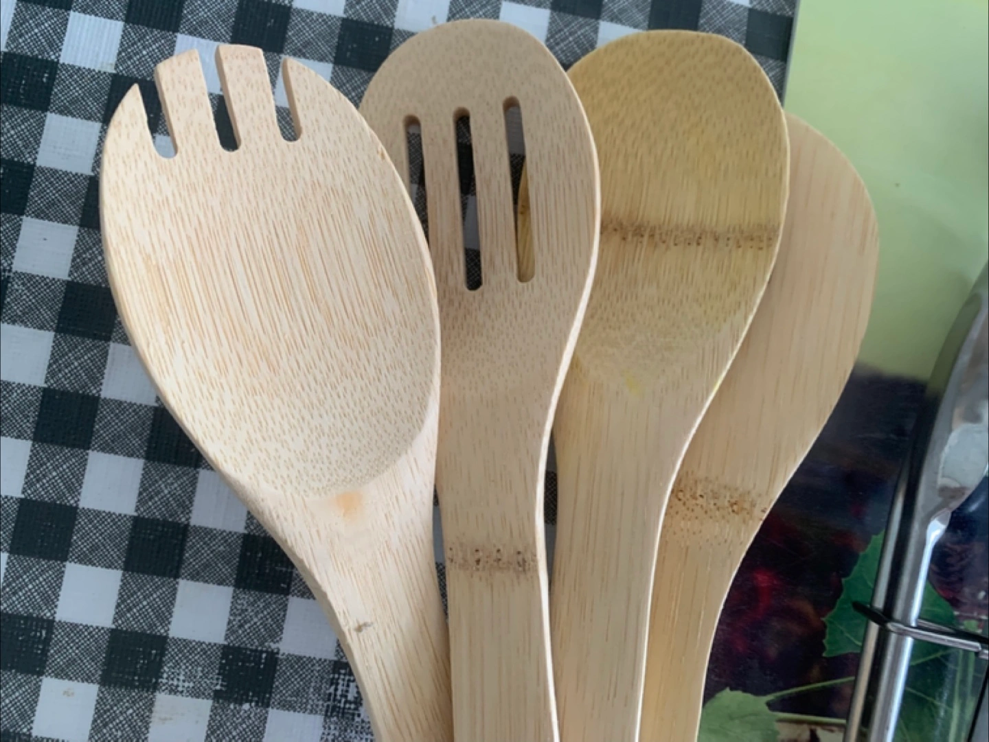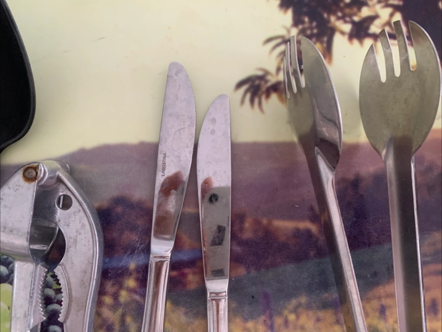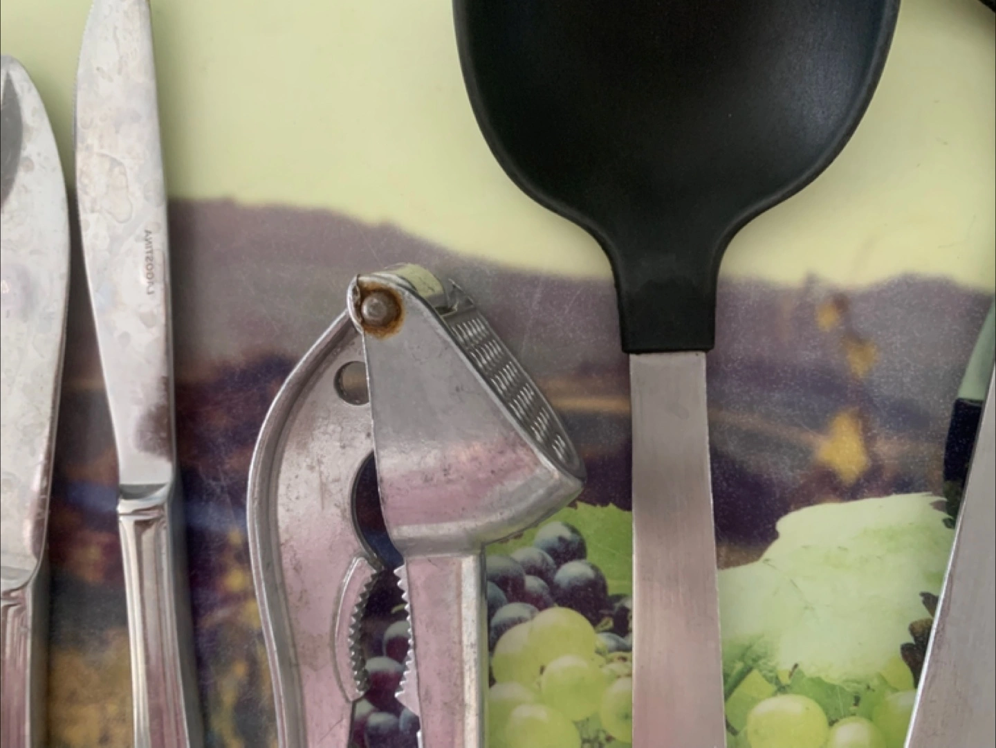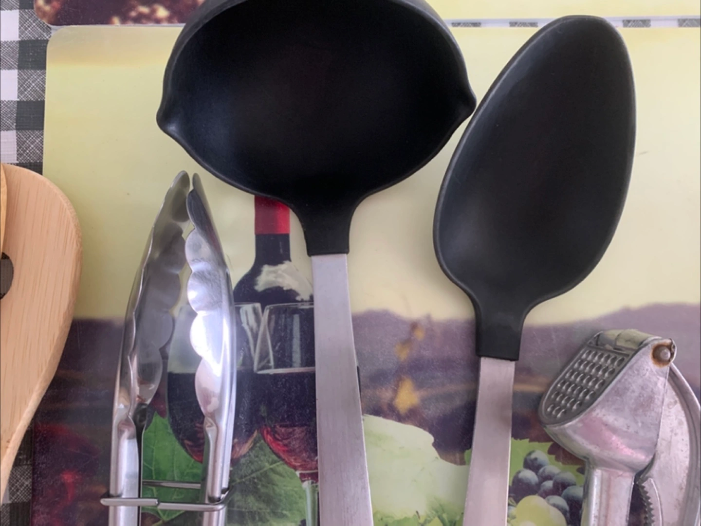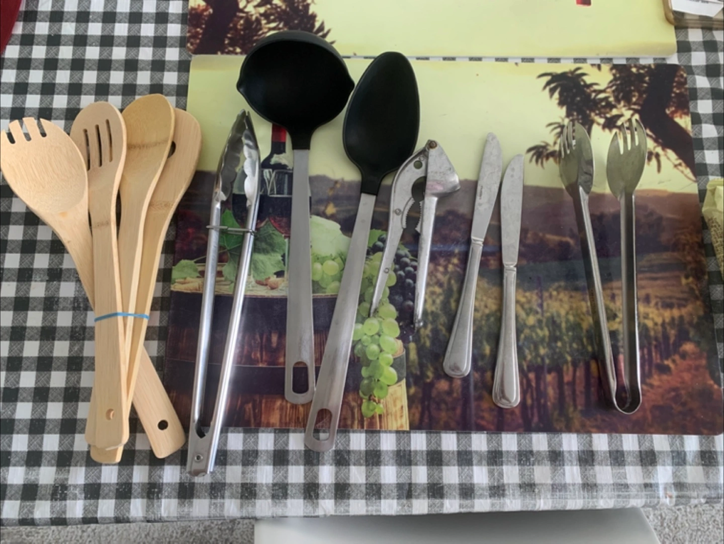 144Selling a mixed set of kitchen utensils. Includes wooden spoons, tongs, knives (Lagostina brand), a garlic press, and a black ladle and spoon. Great for stocking a new kitchen or supplementing your current collection!