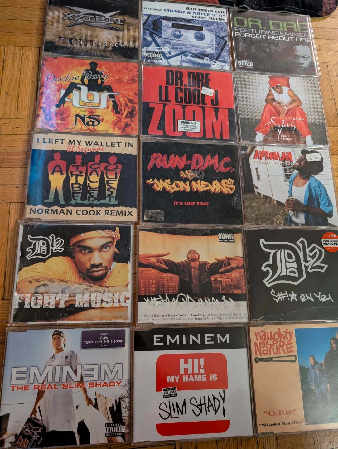 184Selling a collection of 15 hip hop single CDs! Featuring artists like Eminem, Dr. Dre, Run-DMC, Xzibit, and more. A great mix of classic single albums for any hip hop head! Hard to find. Complete with booklets