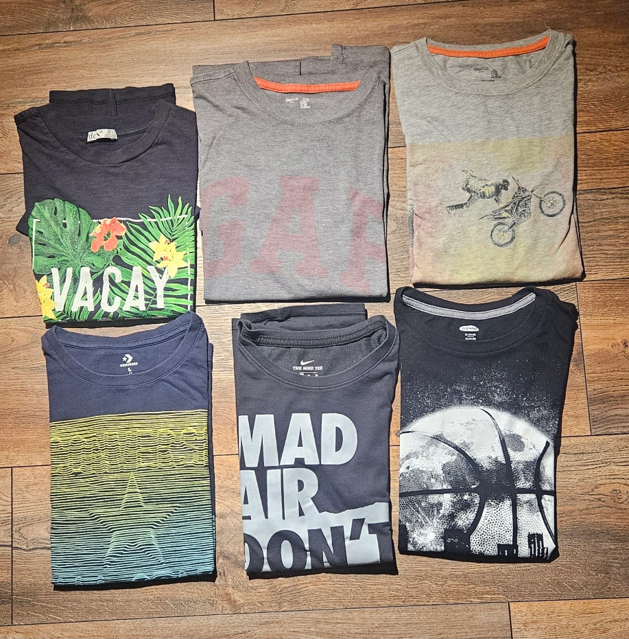 Selling a mixed lot of boys' t-shirts, all in size L- XXL Includes brands like Gap, Nike, Converse, and Old Navy. A variety of colours and designs, perfect for everyday wear!