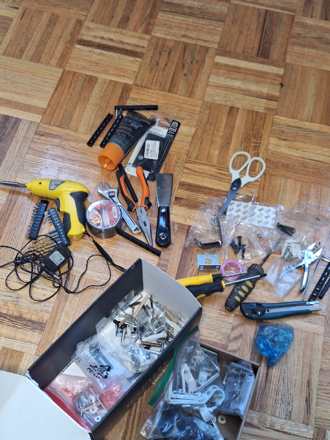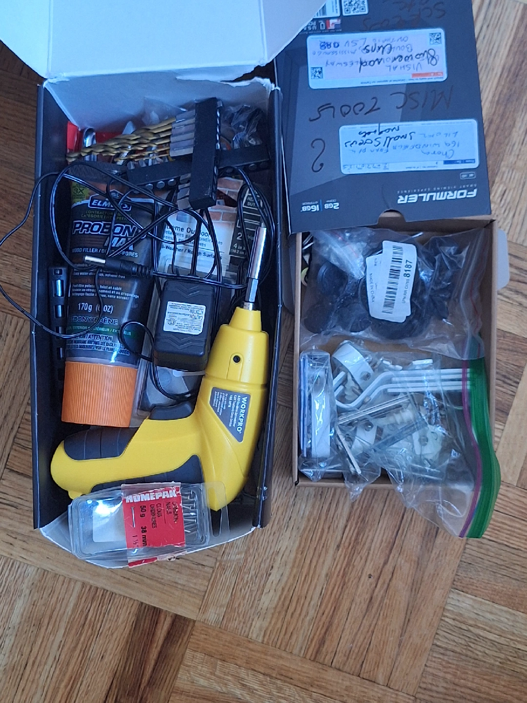 moving sale Selling workpro cordless screwdriver and a mixed lot of hardware and tools! Includes various screws, nails, brackets, and other fasteners and many other items. Also includes hand tools such as screwdrivers, pliers, a wrench, and a utility knife. Great for DIY projects or stocking up your workshop. take all for $20/ OPO. two boxes full of tools.worth $150/. pick up from deer park crescent st clair toronto