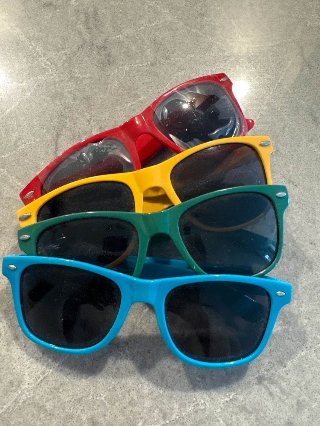 18Selling a fun mixed lot of sunglasses! You'll get four pairs in total, each with a unique design: - A red pair with a small logo with Raptors - A yellow pair with "Let's go for a ride" printed on the side - A green pair branded with Moosehead Lager - A blue pair that says Barefoot Wine & Bubbly