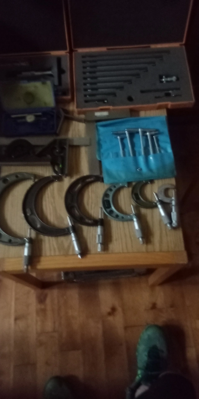Here's a collection of precision measuring tools. They appear to be in good condition and include a variety of different types and sizes. The tools are stored in cases and pouches for protection and organization