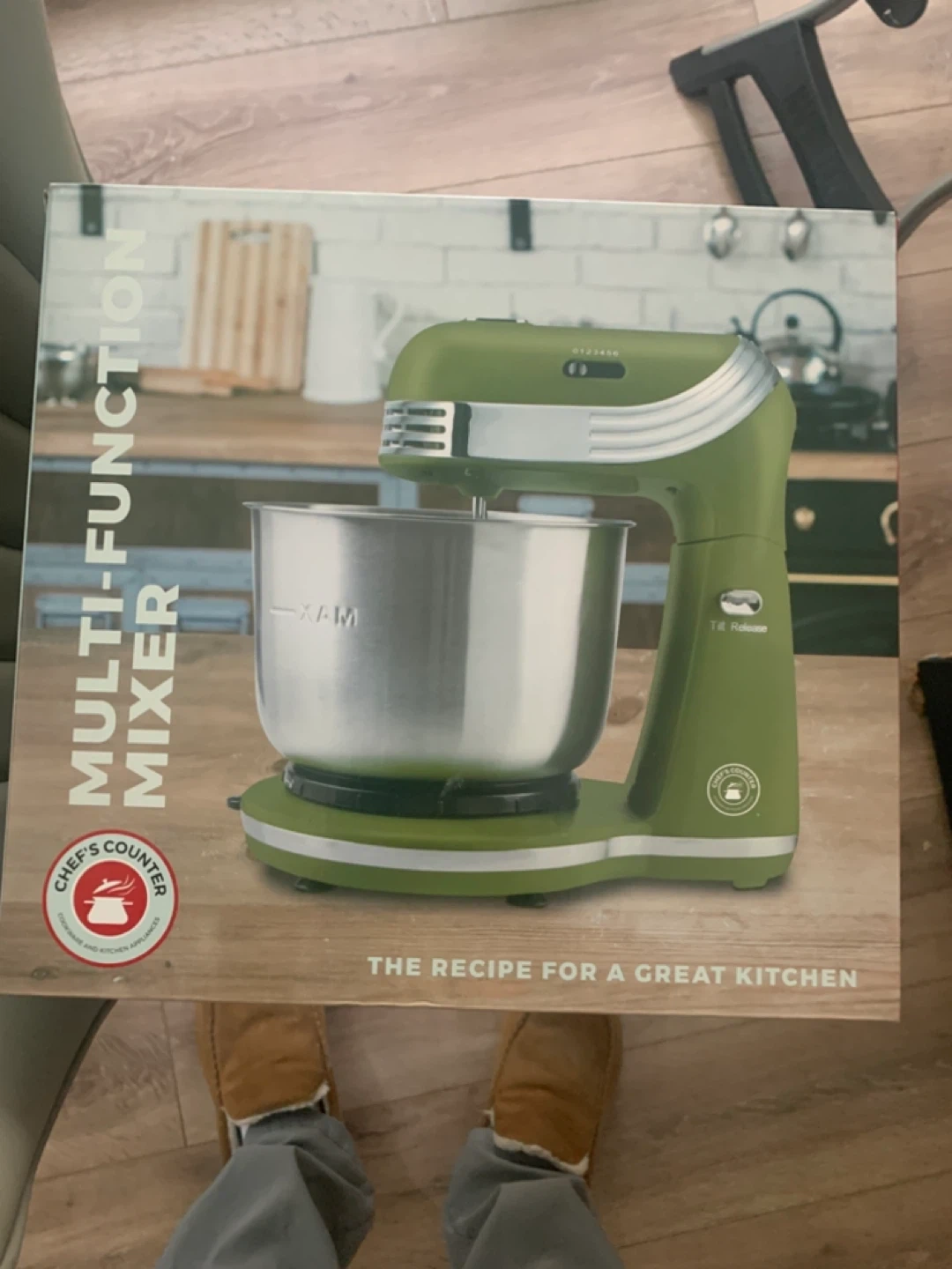 60Selling a Chef's Counter multi-function mixer in olive green! This mixer comes with a 3L stainless steel bowl and chrome-plated standard beaters and dough hooks. It features 6-speed functions and a tilt-up head for easy operation. The dimensions are 11.46 x 7.95 x 10.43 inches. The box is included