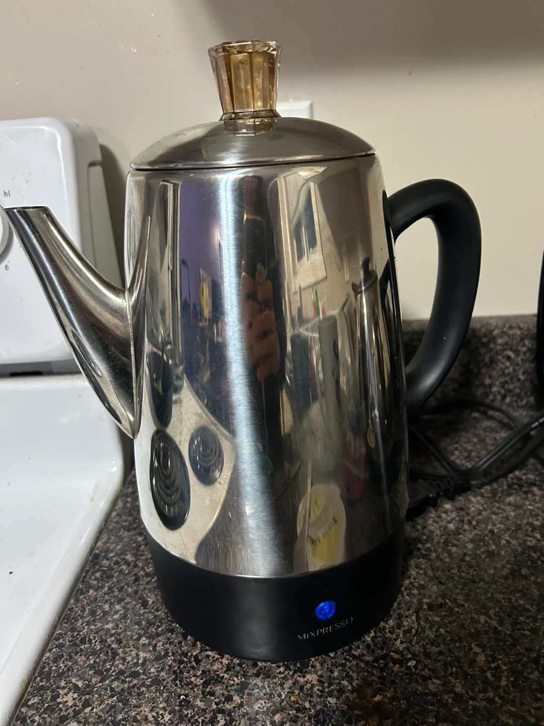 162I'm selling a mixpresso percolator coffee maker! It's in great shape and ready to make some delicious coffee. It comes with the power cord and all inserts, so you're all set to plug it in and get brewing. Sorry no refunds. Cash or e-transfer only. Payment to be made at pickup Up. Pick up place is the A&W on 200st Langley.