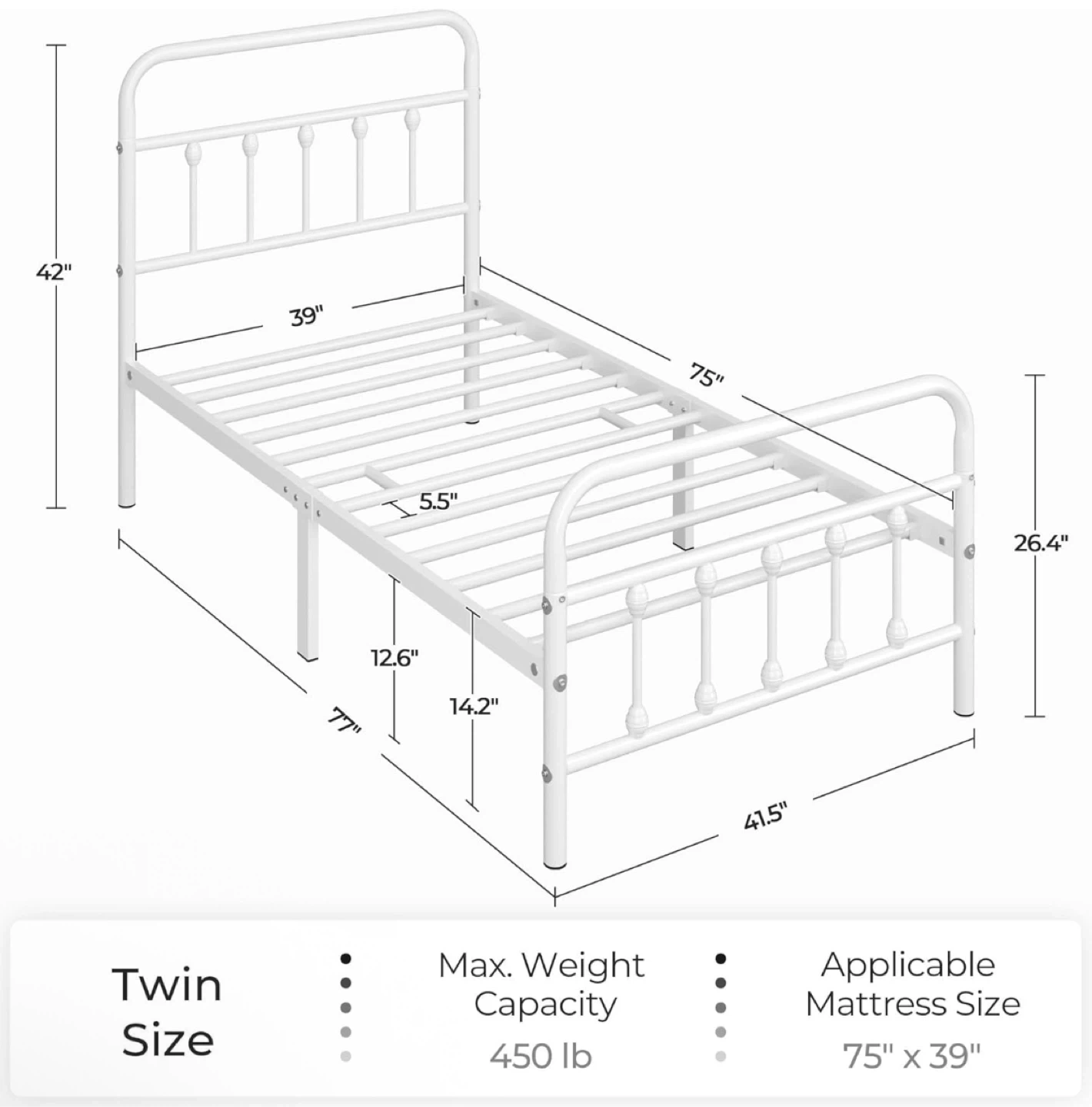 This is a white metal twin bed frame. It measures 77" long by 41.5" wide. The bed has built-in slats to prevent the mattress from sliding. Max weight capacity is 450 lb.In perfect condition. I can also give my mattress for free along with the frame. No bed bugs.