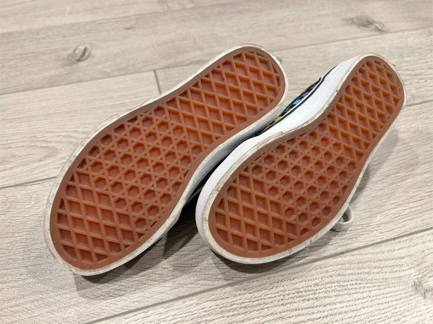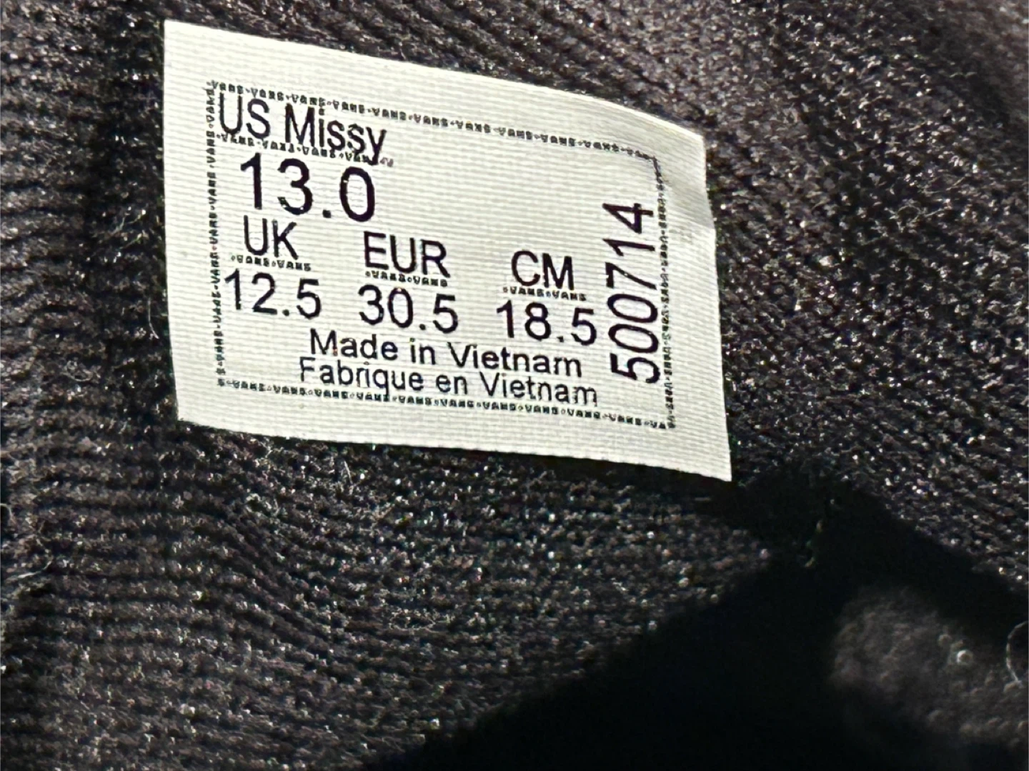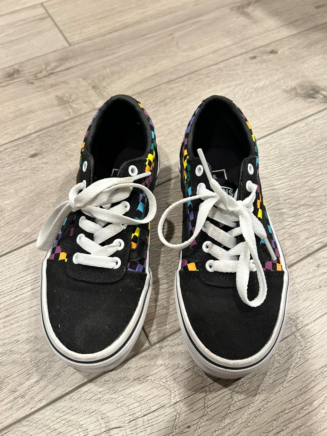 Classic Vans sneakers featuring a black base with a colourful checkerboard pattern. These are a kid's size 13
